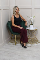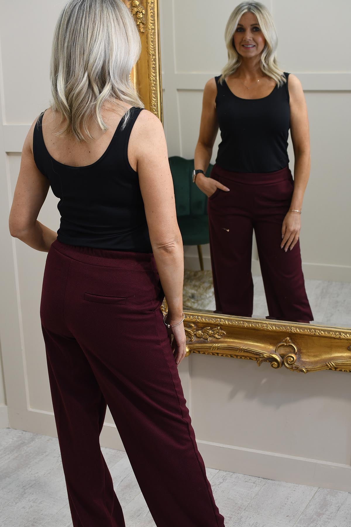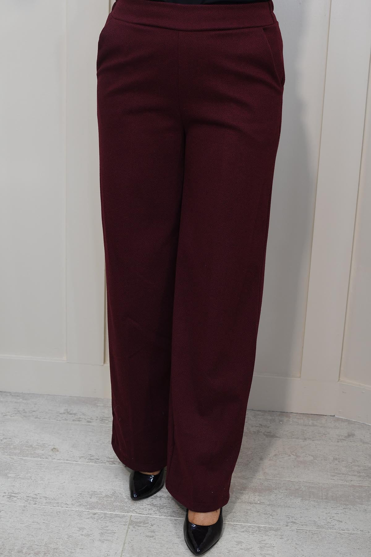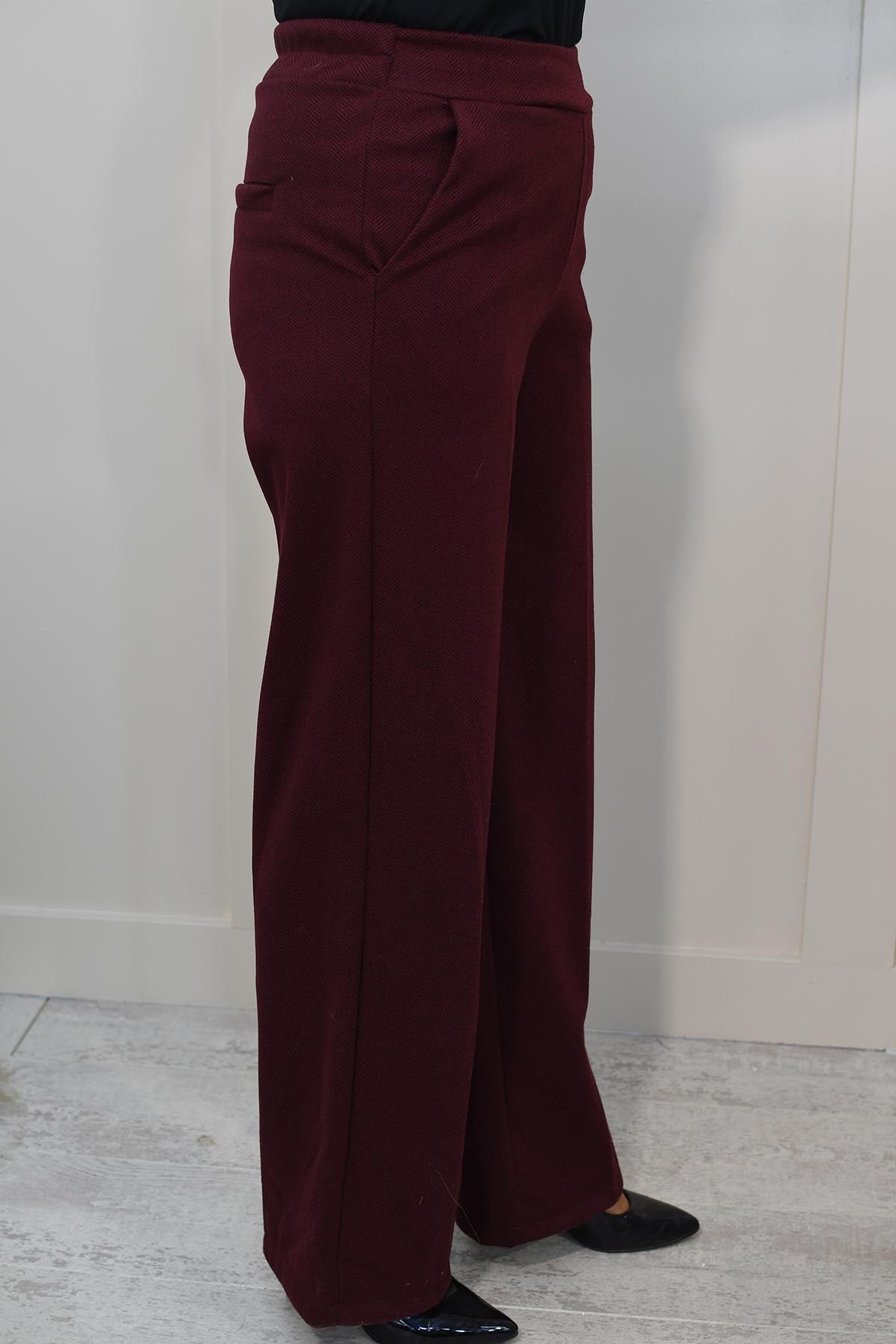 Decollage Herringbone Wide Leg Trousers With Elasticated Waist- Burgundy HB2435