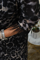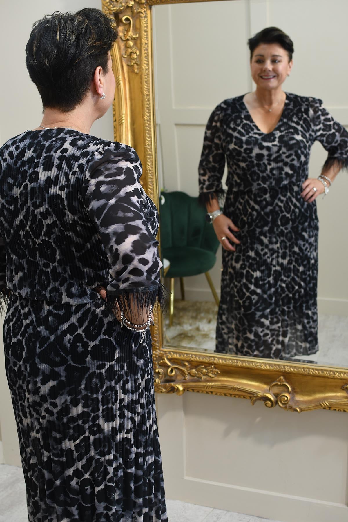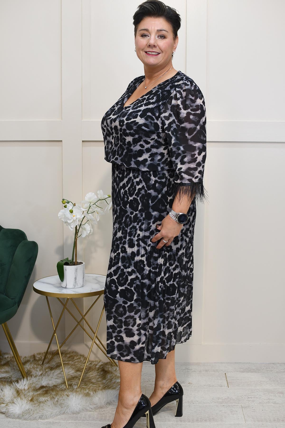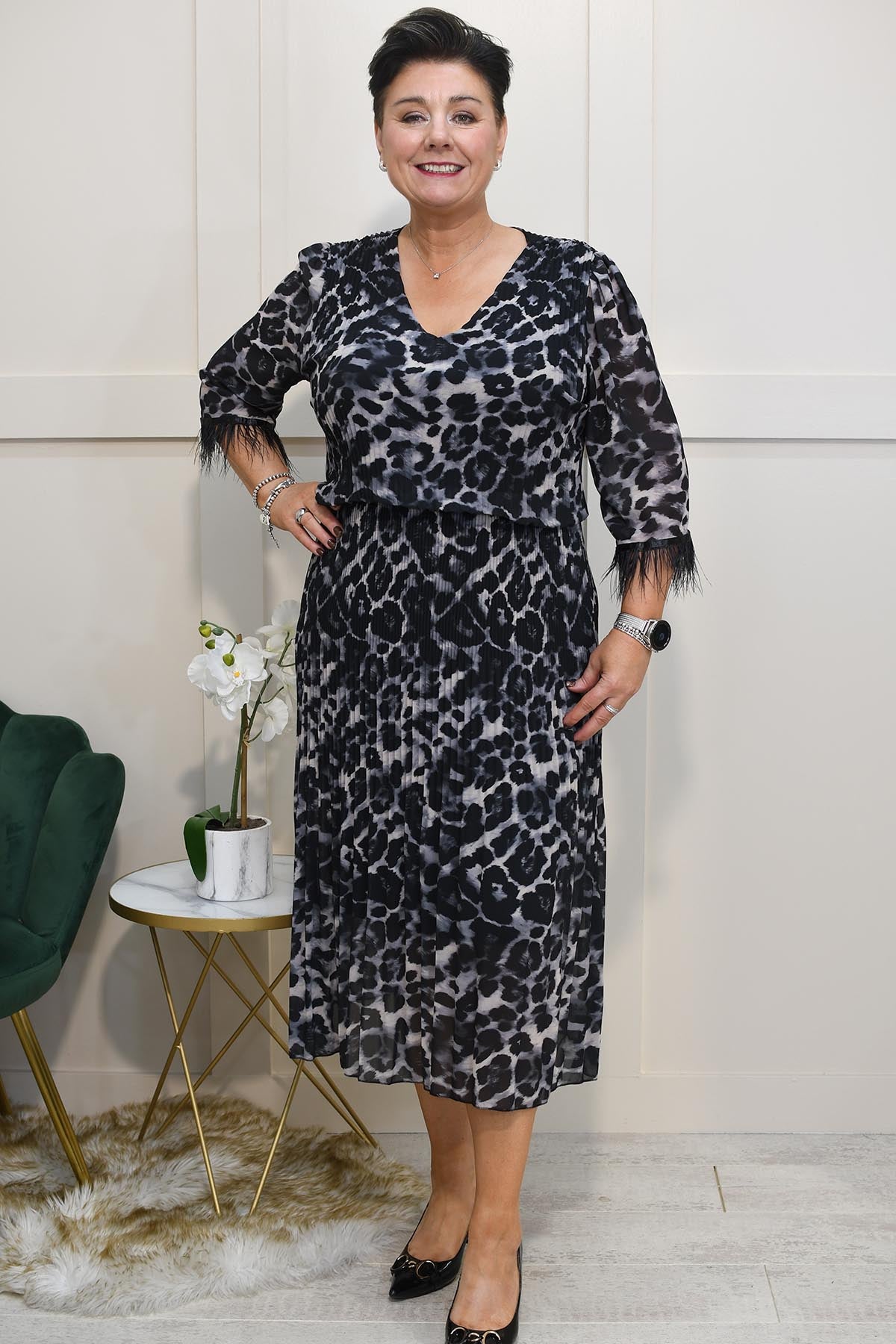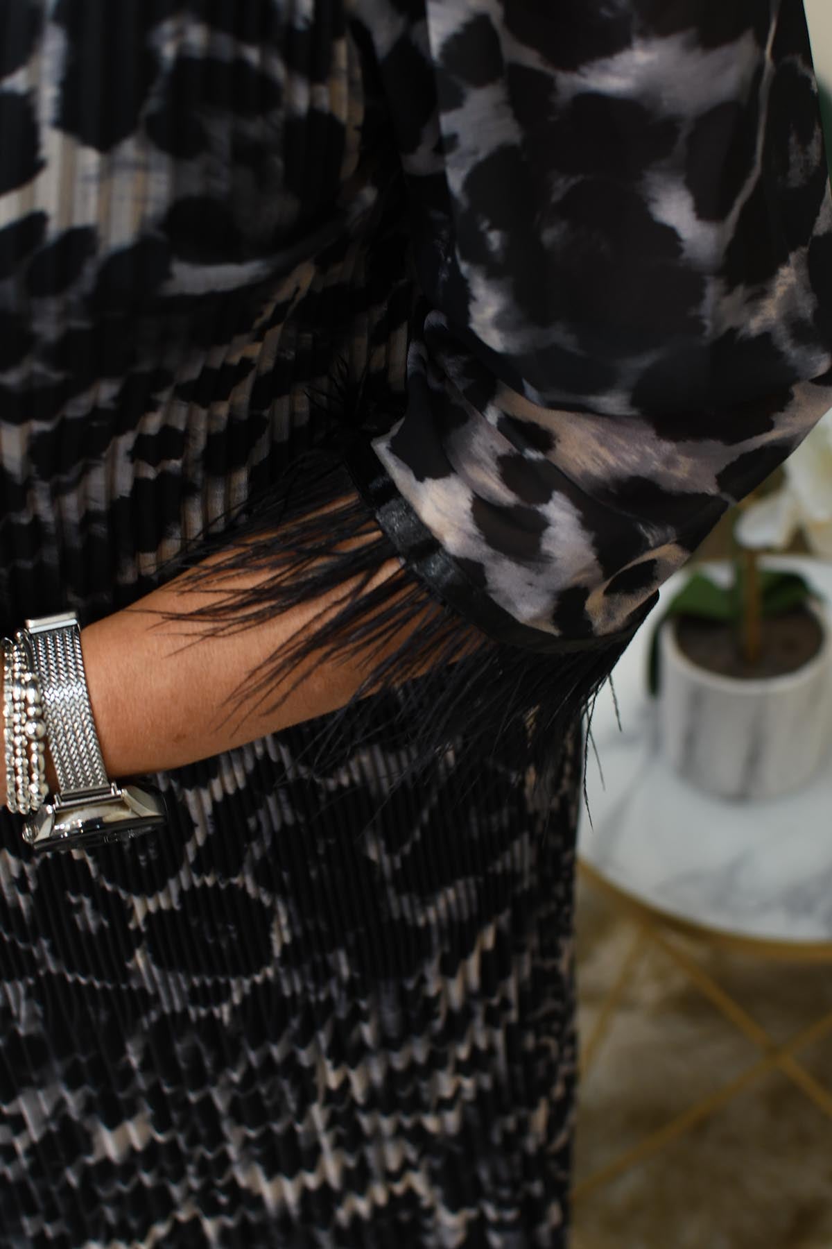 Kyla Leopard Print Dress With Feather Sleeve Detail- Black 5854P