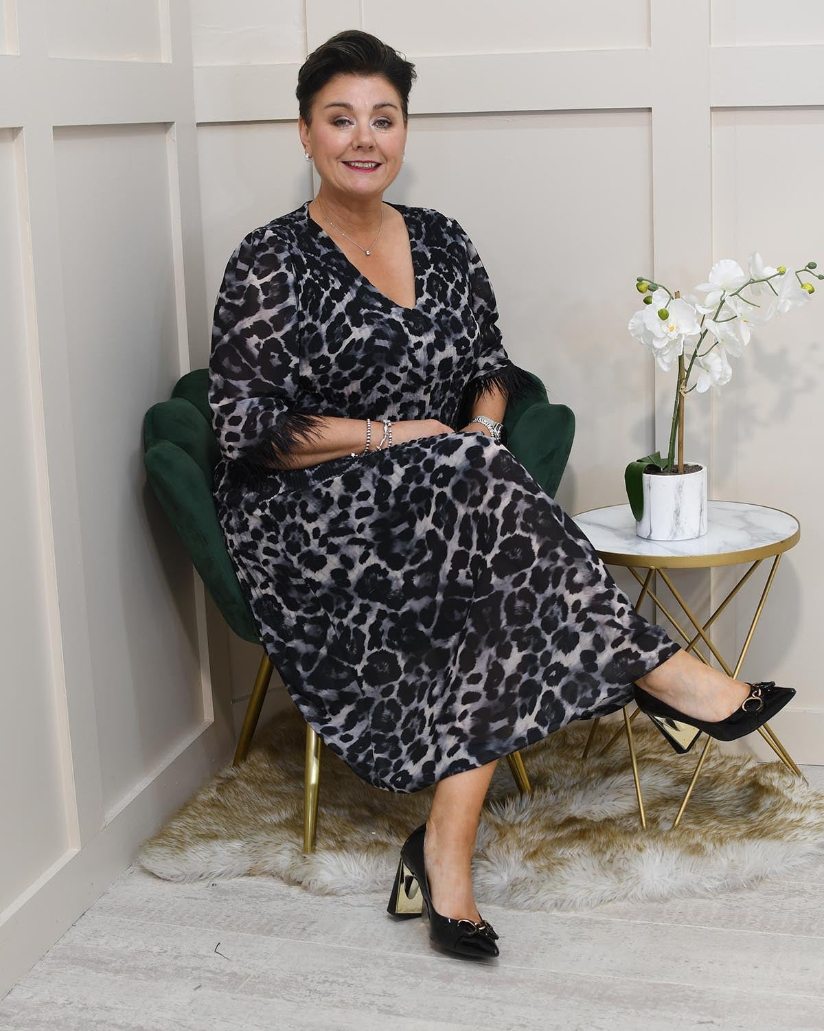 The Kyla Leopard Print Dress with Feather Sleeve Detail in Black is a statement piece that perfectly blends sophistication with bold style. Crafted from a soft, stretchy blend of 95% viscose and 5% elastane, it offers a flattering fit that moves comfortably with you. The classic leopard print brings timeless appeal, while the feather-trimmed sleeves add a touch of playful glamour and texture. Ideal for evening events, parties, or special occasions, this dress combines comfort with eye-catching elegance. Pair it with heels and minimal accessories for a confident, fashion-forward look that’s sure to turn heads.