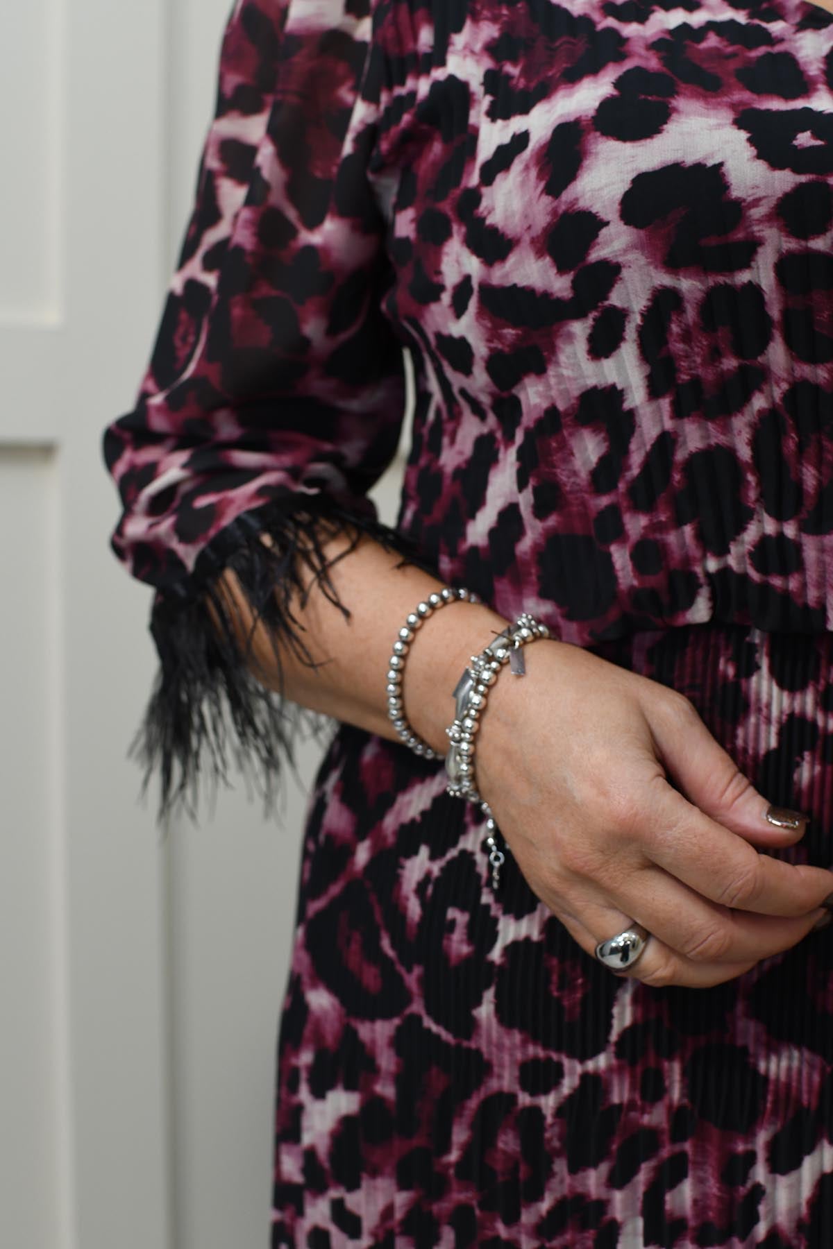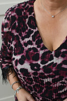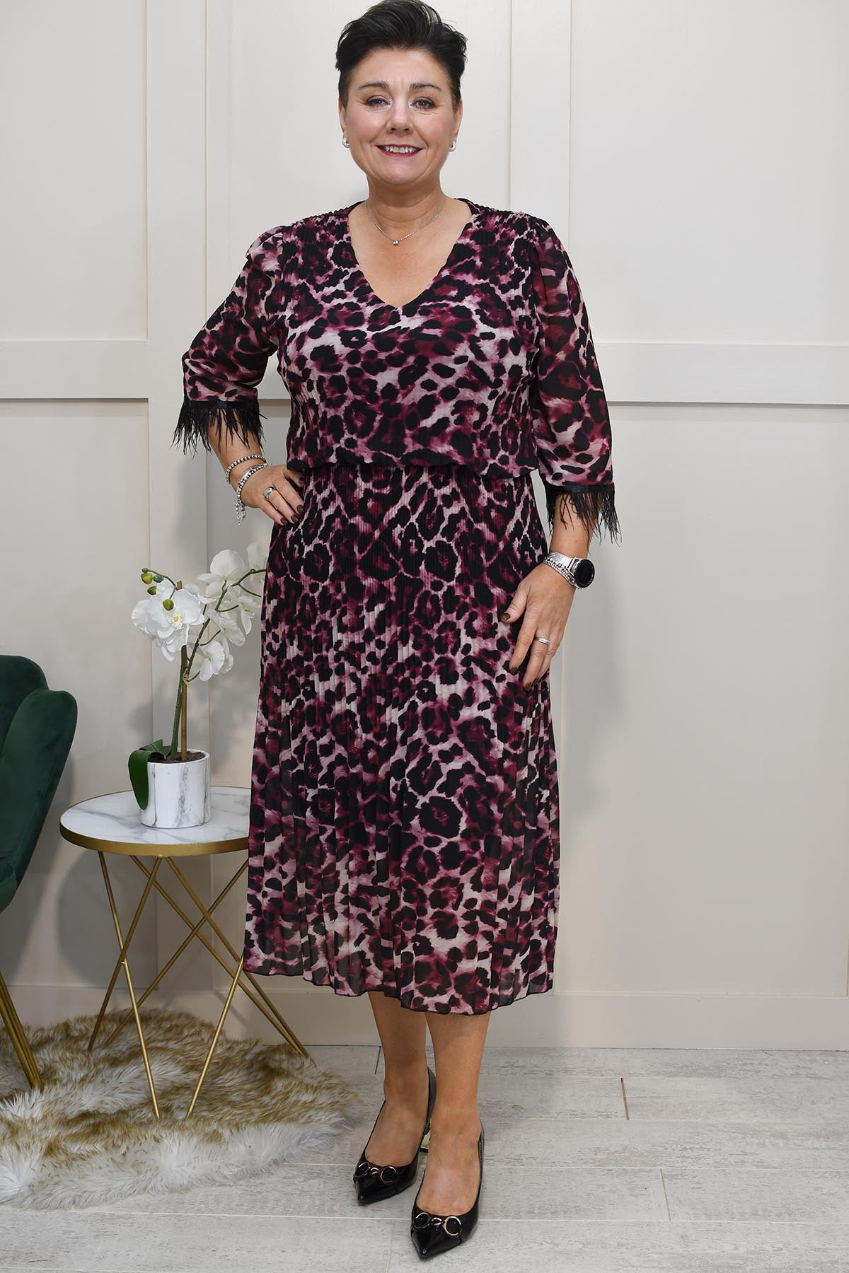 Kyla Leopard Print Dress With Feather Sleeve Detail- Wine 5854P