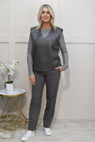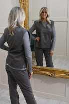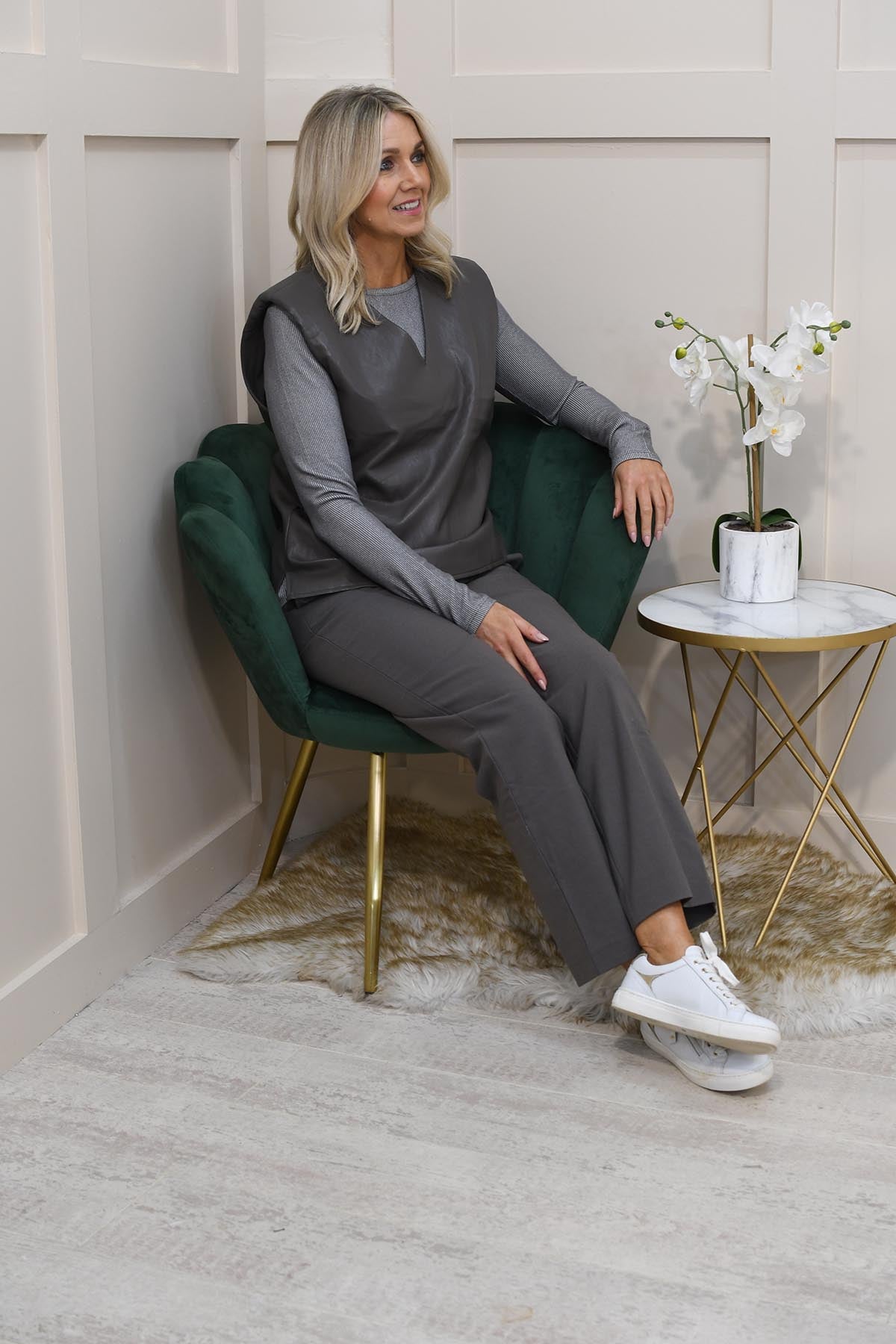 Crafted from 100% polyester with a sleek faux leather finish, this dark taupe grey YAYA top with V-Neck offers a modern twist on a wardrobe essential. The soft vegan leather texture provides a luxurious look and feel while remaining lightweight and easy to style. Ideal for smart-casual or evening outfits, this faux leather top pairs effortlessly with tailored trousers, skirts, or denim. A standout piece that adds sophistication and fashion-forward appeal to any wardrobe.