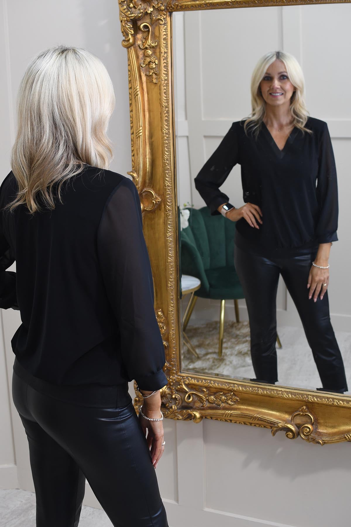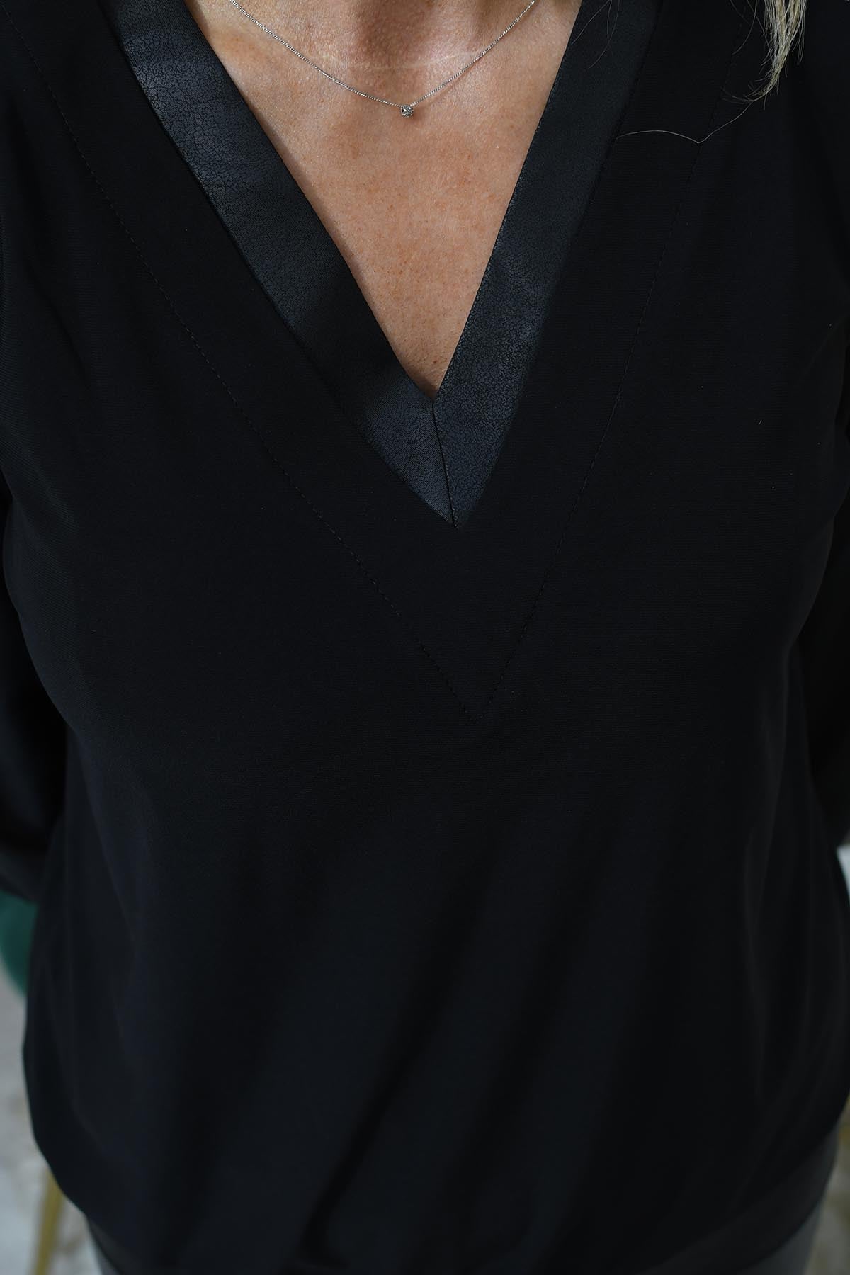 Haut noir à col en V avec détails de poignets en similicuir YEW - 4278 Tucker