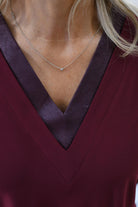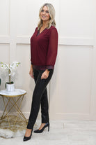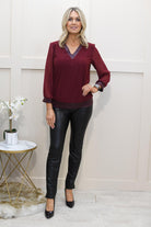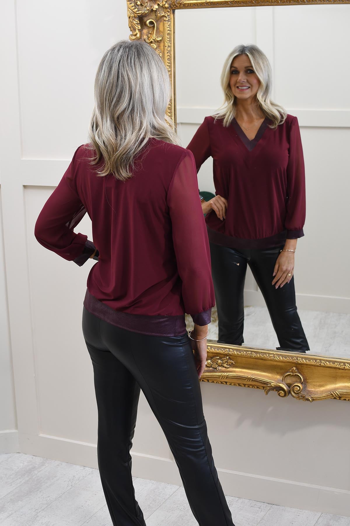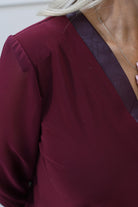 YEW V-Neck Top With Pleather Cuff Detail- Burgundy 4278 Teresa