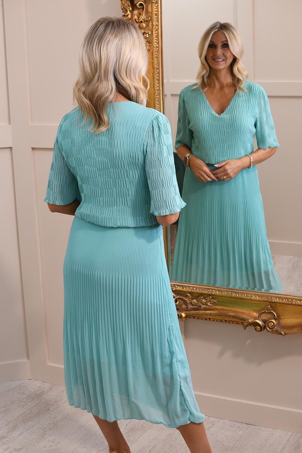 Introducing the Kyla Mint Plissé Dress, a harmonious blend of comfort and contemporary style. Crafted from lightweight plissé fabric, this dress features a beautiful airy mint colour. The pleated texture offers graceful movement, while the relaxed silhouette ensures all-day comfort. Ideal for both casual outings and special occasions, this versatile piece pairs effortlessly with your favourite accessories. Key features include a flattering fit, breathable fabric, and an eye-catching design. Perfect for those seeking a stylish and comfortable addition to their wardrobe.