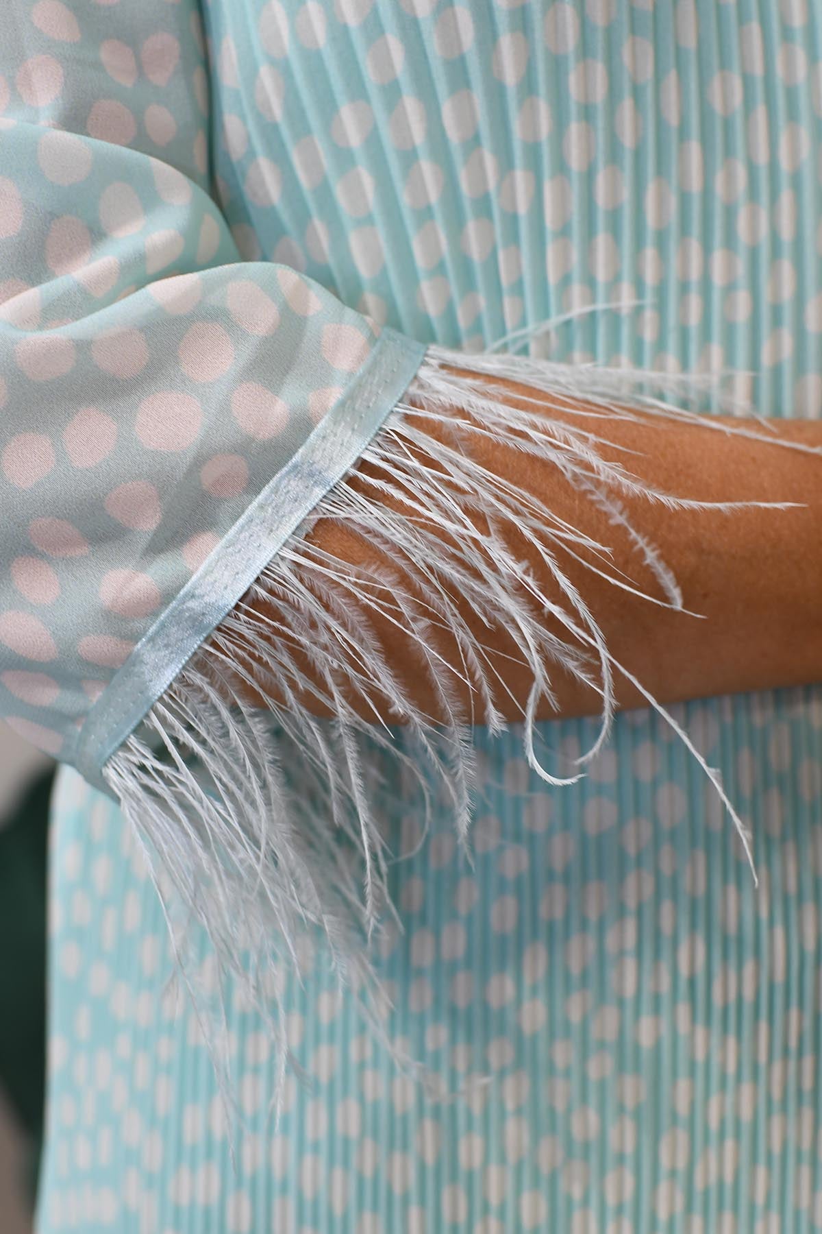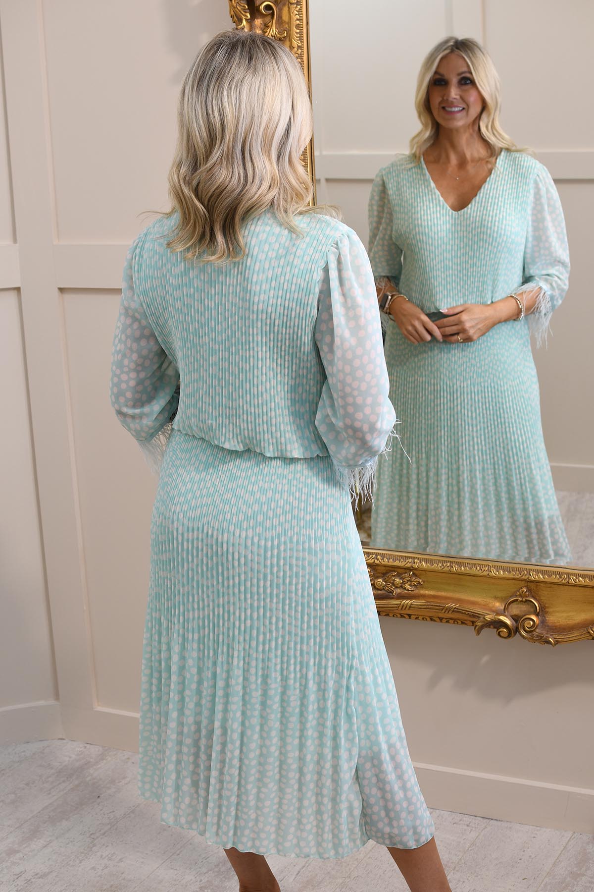Kyla Mint Polkadot Plisse Dress With Feather Boa Trim- 5854P