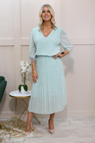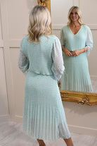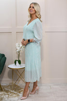 Turn heads in the Kyla Mint Polkadot Plissé Dress with Feather Boa Trim a statement piece that blends playful elegance with bold sophistication. Crafted from lightweight plissé fabric, this midi dress features a flattering A-line silhouette and an all-over mint polkadot pattern. The standout feather boa trim on the sleeves adds a touch of vintage glamour, perfect for parties or special occasions. Designed for comfort and flair, it offers easy movement while delivering high-impact style. Ideal for fashion-forward women seeking unique dresses, this trend-setting design is perfect for summer events, cocktail parties, and evening wear.
