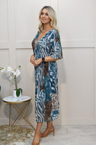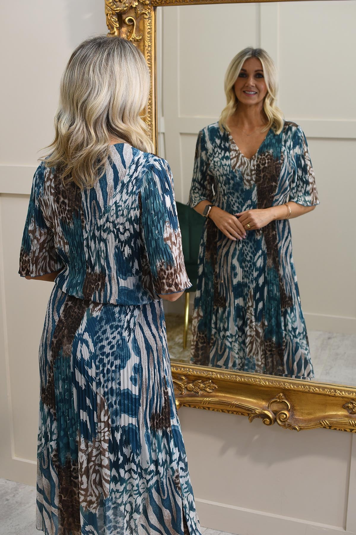 Step out in style with this teal and brown mixed animal print plissé dress from Kyla, designed to flatter with its elegant texture and flowing silhouette. Crafted from a lightweight blend of 95% viscose and 5% elastane, it offers breathable comfort with gentle stretch for ease of movement and a flattering fit. The plissé fabric adds subtle texture and sophistication, while the bold animal print brings a modern, fashion-forward edge. Perfect for both day and evening occasions, this versatile dress can be styled casually with boots or elevated with heels and accessories for a chic, statement-making look.