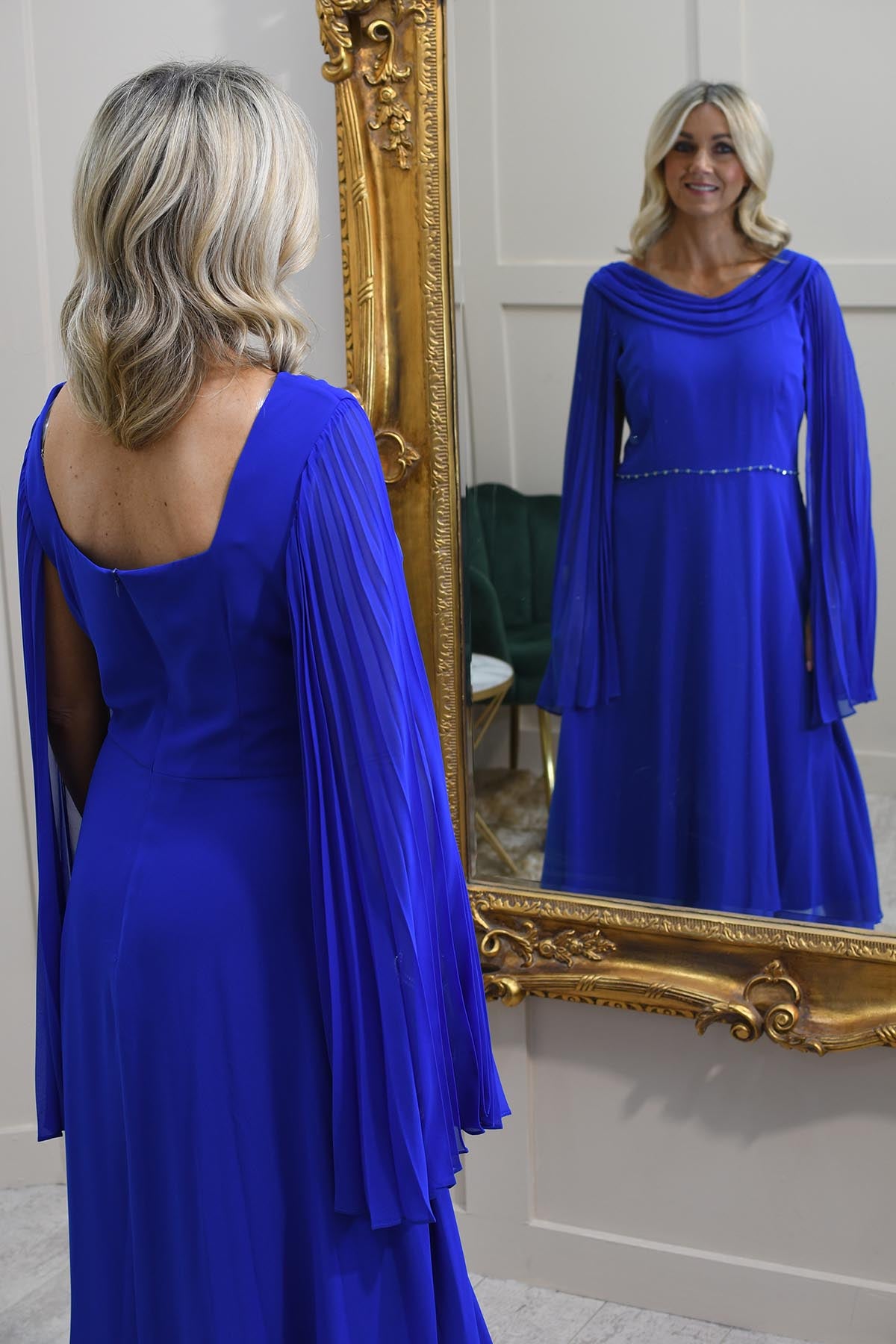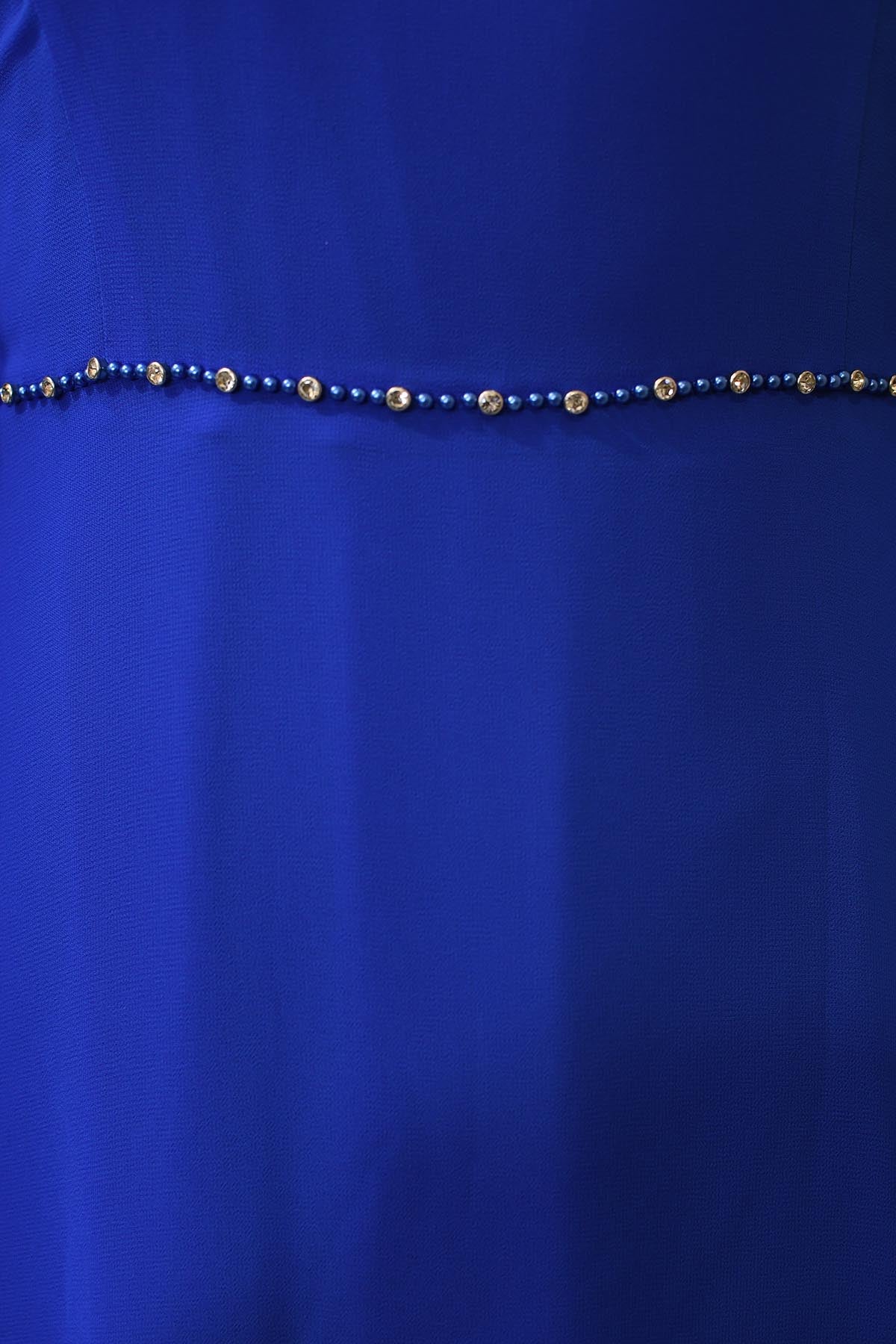 Lizabella Royal Blue Dress With Plisse Sleeve & Diamante Waist Detail - L-25SS-2033-20