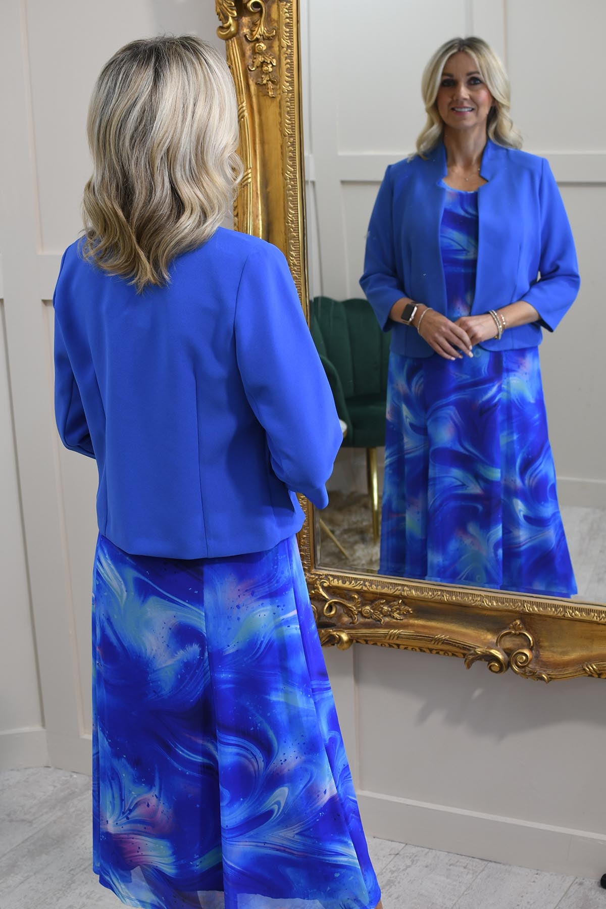 Via Veneto Cornflower Blue Swirl Pattern Dress With Bolero-V324