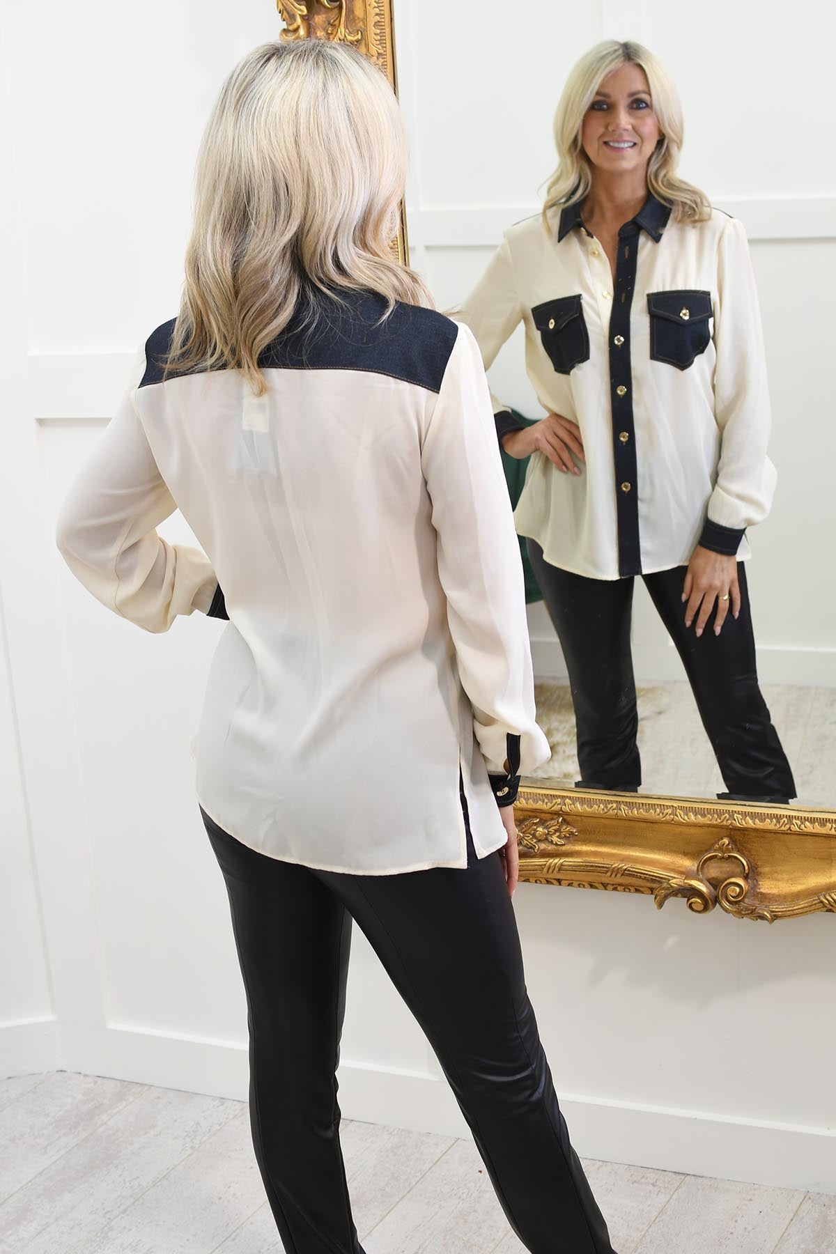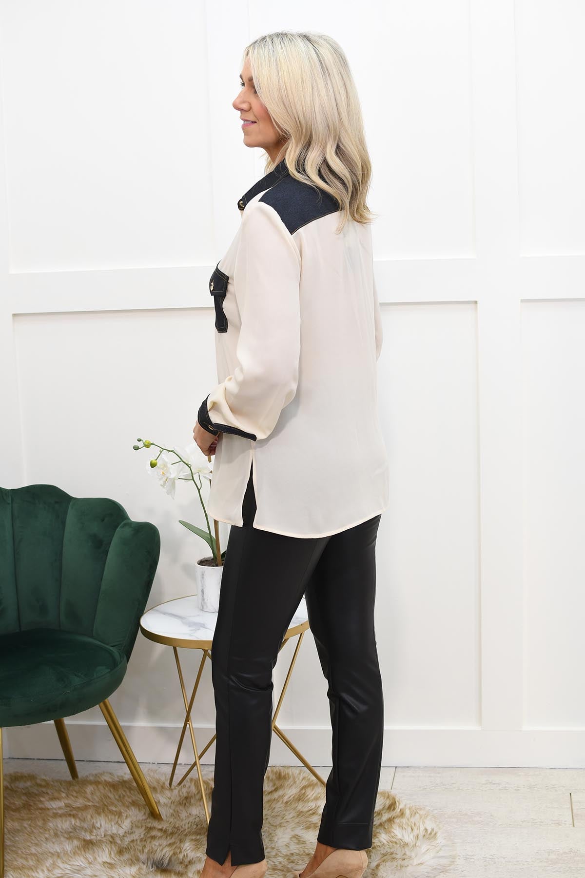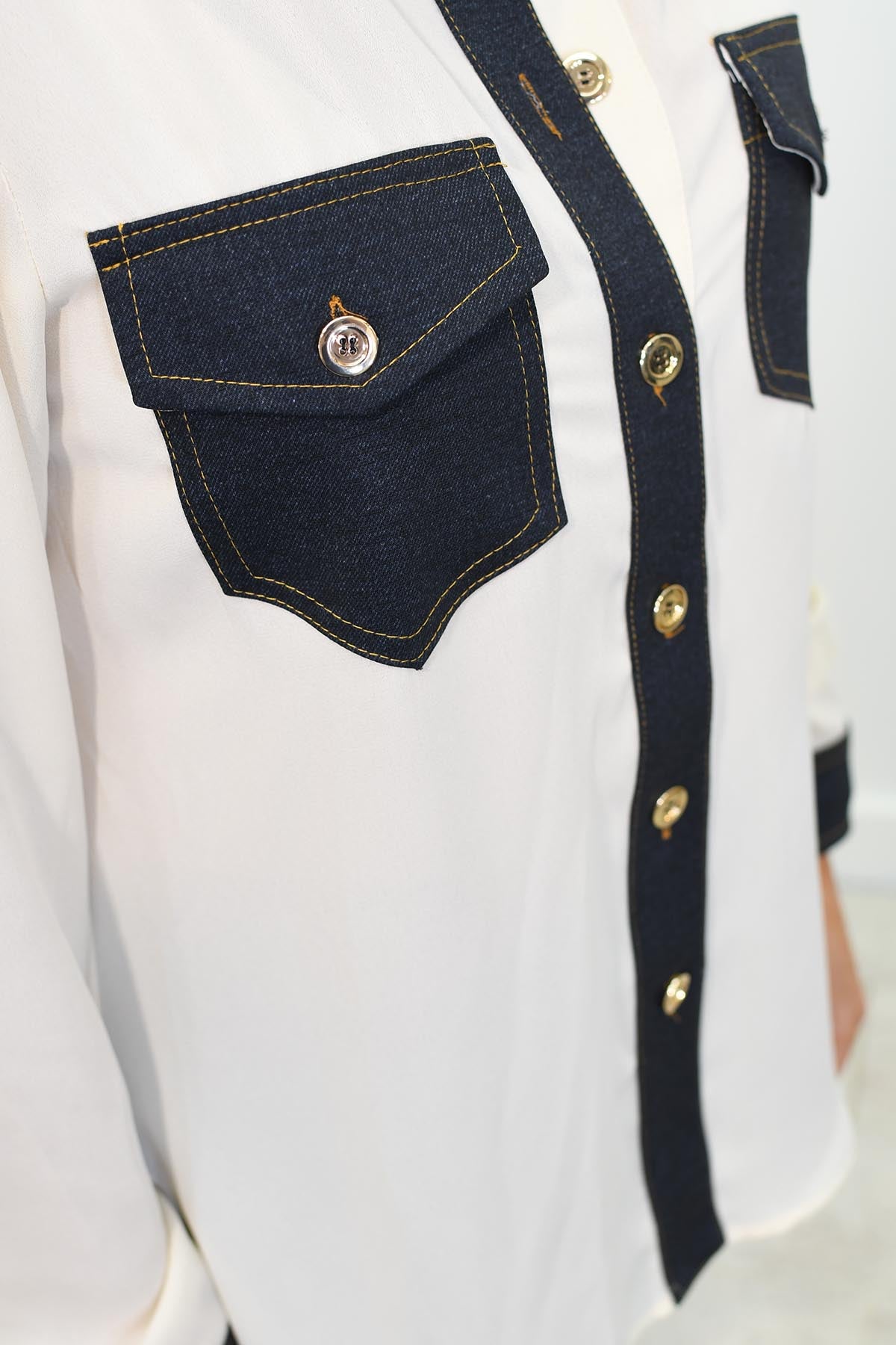 La douce couleur crème offre une base polyvalente qui complète n'importe quelle tenue, tandis que la bordure en denim ajoute un contraste élégant qui apporte une touche de charme décontracté et moderne au design. Les accents en denim, présents le long des bords et des poches, offrent un détail subtil mais distinctif qui améliore l'esthétique générale du chemisier.