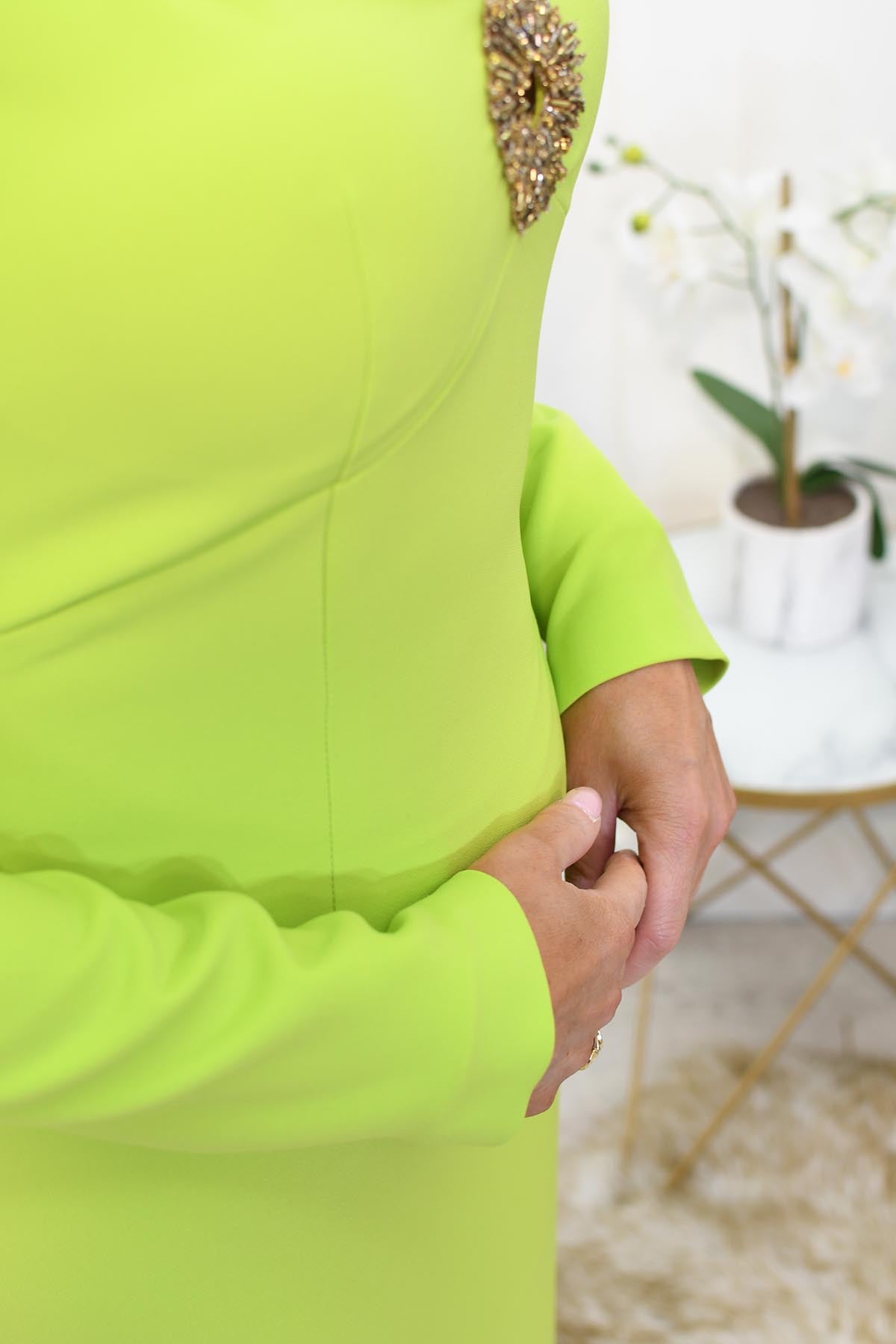 Robe droite vert citron Carla Ruiz avec décolleté en trou de serrure orné de perles - 51002