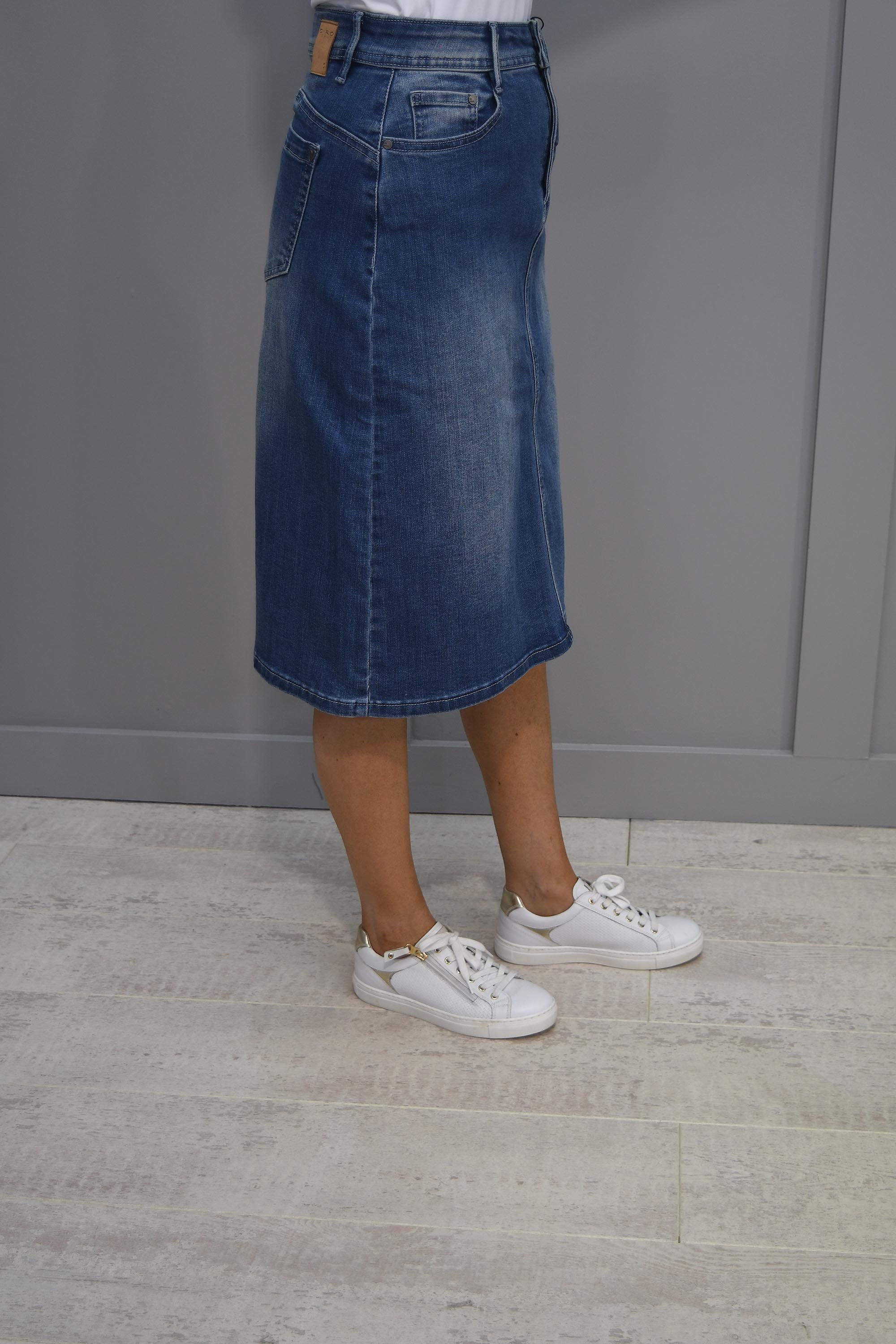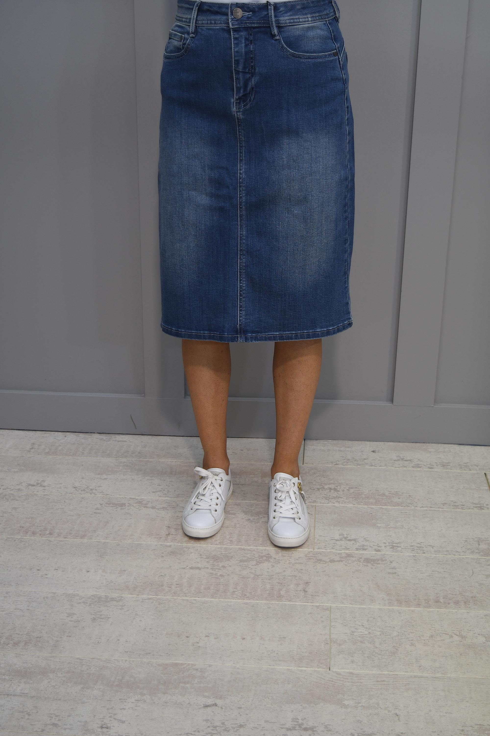 Rehaussez votre style denim avec l'allure intemporelle de la jupe midi en denim délavé bleu CRO, une pièce polyvalente qui respire la sophistication décontractée.