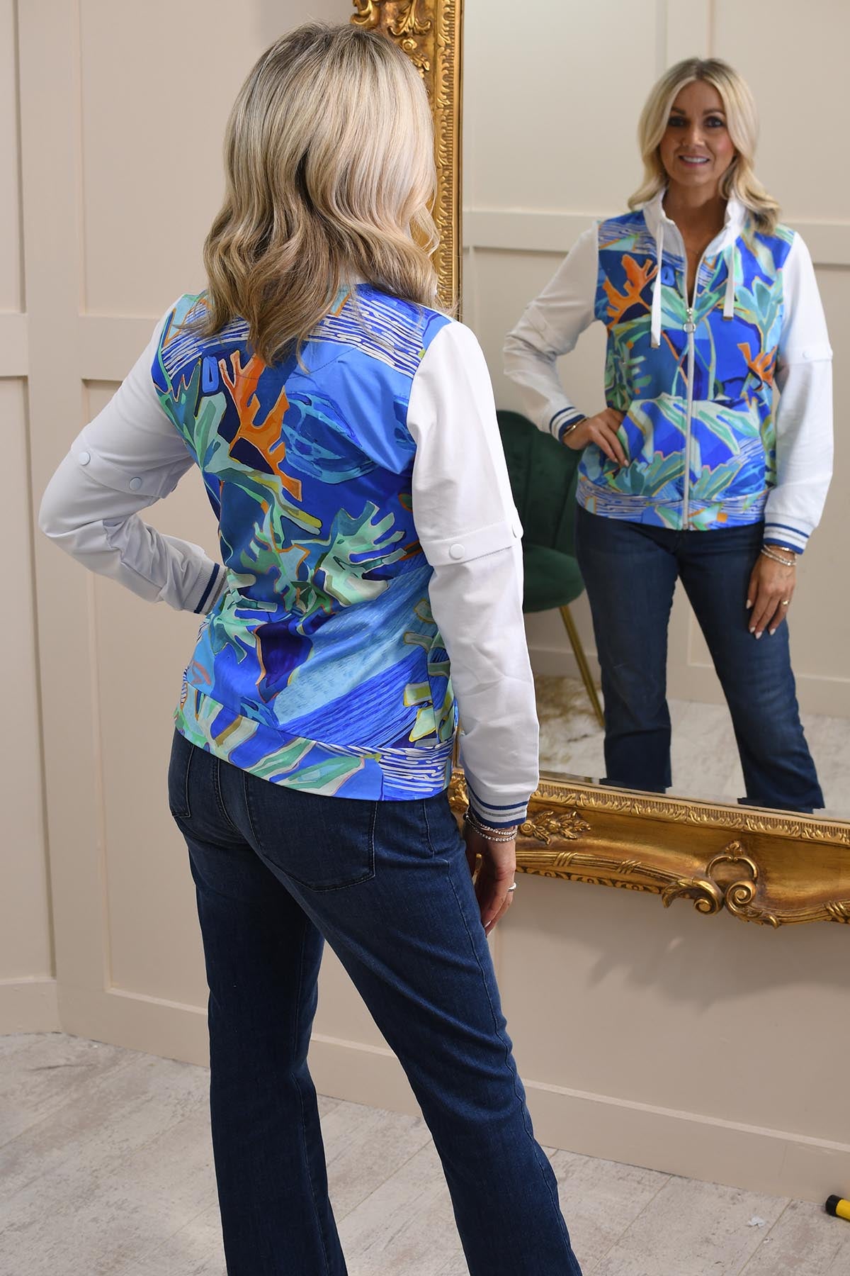 Upgrade your casual wardrobe with the Dolcezza Tropical Leaf Print High Neck Zip-Up Jacket from the Palmetto Series. Made from a premium blend of 75% cotton, 15% polyester, and 10% elastane, this jacket offers a comfortable and stretchy fit while maintaining its shape. The vibrant tropical leaf print brings a touch of paradise to your look, while the high neckline and zip-up front provide a modern, sporty vibe. Ideal for layering over tees or lightweight tops, this jacket adds a pop of colour and style to any outfit. Perfect for casual days or holiday adventures.