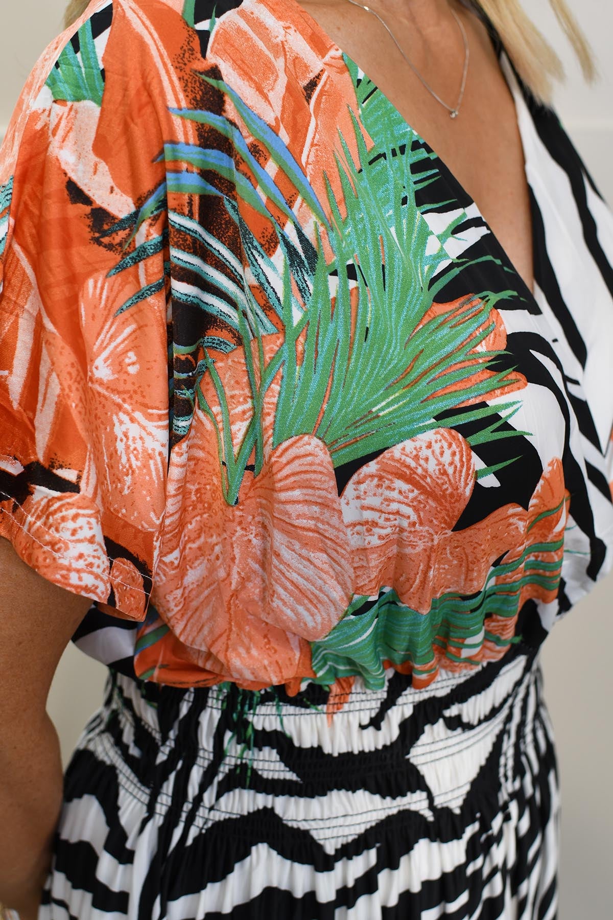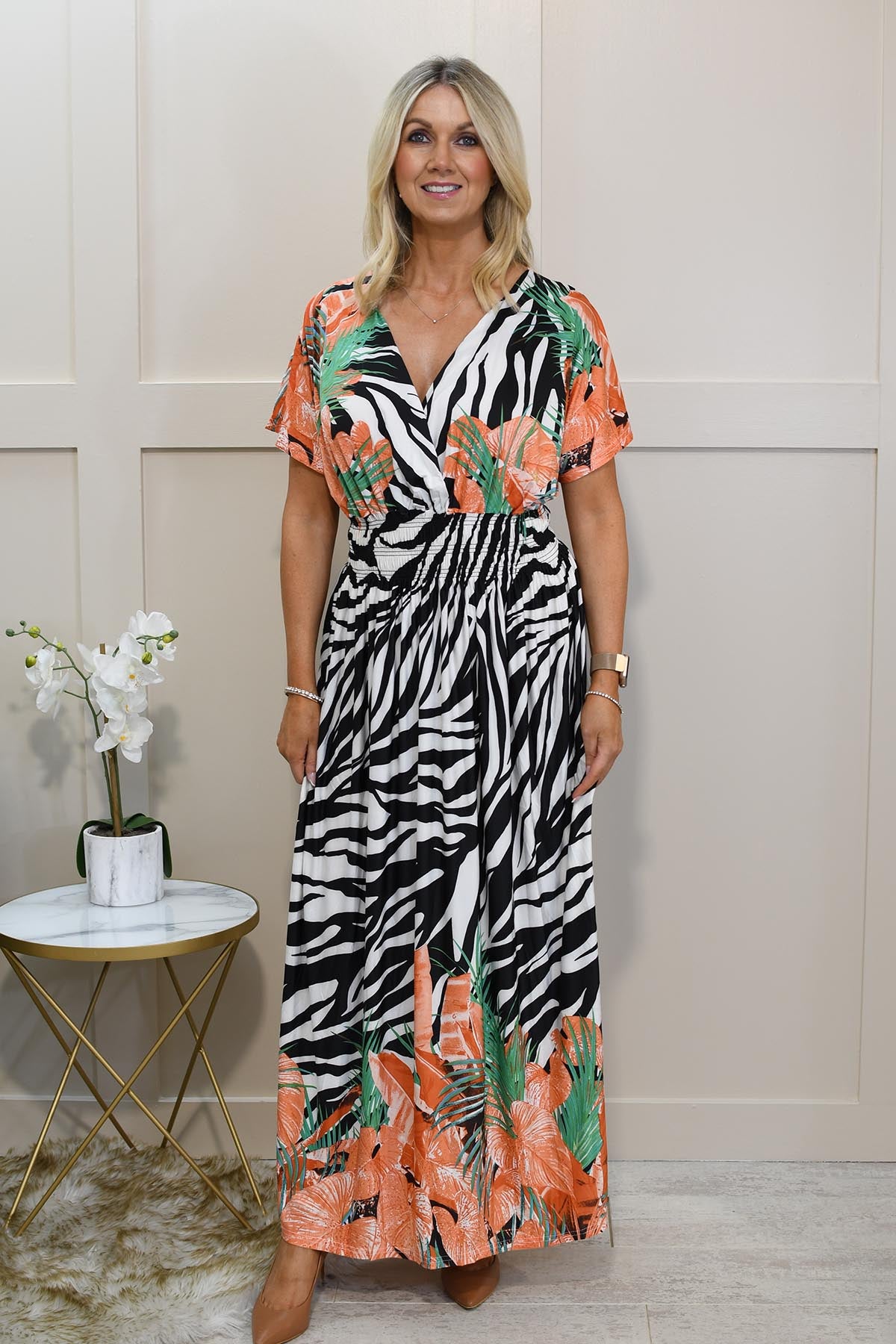 Step into bold summer style with the Elena Z Peach Tropical & Zebra Print Magic Fit Maxi Dress. Crafted from ultra-stretchy, breathable fabric, this one-size-fits-all maxi dress offers a flattering silhouette for every body shape. The striking blend of lush tropical foliage and zebra print creates an exotic, eye-catching look—ideal for hot holidays, beach escapes, and stylish summer garden parties. Its magic fit design ensures maximum comfort and easy movement, while the vibrant peach palette keeps things fresh and on-trend. Lightweight and pack-friendly, it’s the effortless statement piece your warm-weather wardrobe needs.