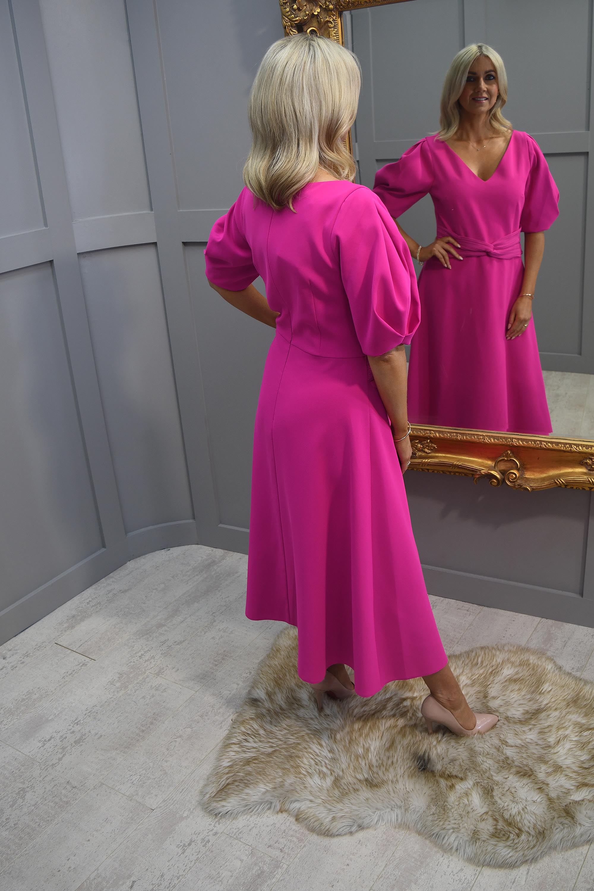 Robe rose vif Lizabella avec taille froncée et manches bouffantes plissées - L-24SS-2910-40