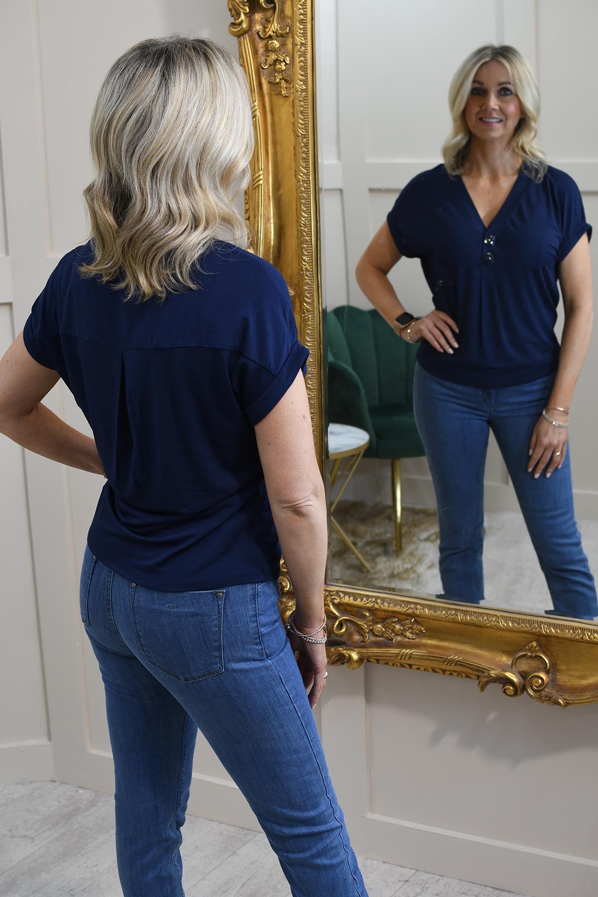 Elevate your everyday wardrobe with the Marble Navy Relaxed Fit Top With Button Detail. Crafted from a soft and breathable blend of 95% viscose and 5% elastane, this top offers exceptional comfort with a relaxed, flattering fit. The navy hue makes it a versatile staple, while the chic button detail adds a stylish finishing touch. Designed with a classic round neckline and long sleeves, this effortlessly elegant piece pairs perfectly with jeans for a casual look or tailored trousers for a polished outfit—a must-have for timeless, easy-to-wear fashion.