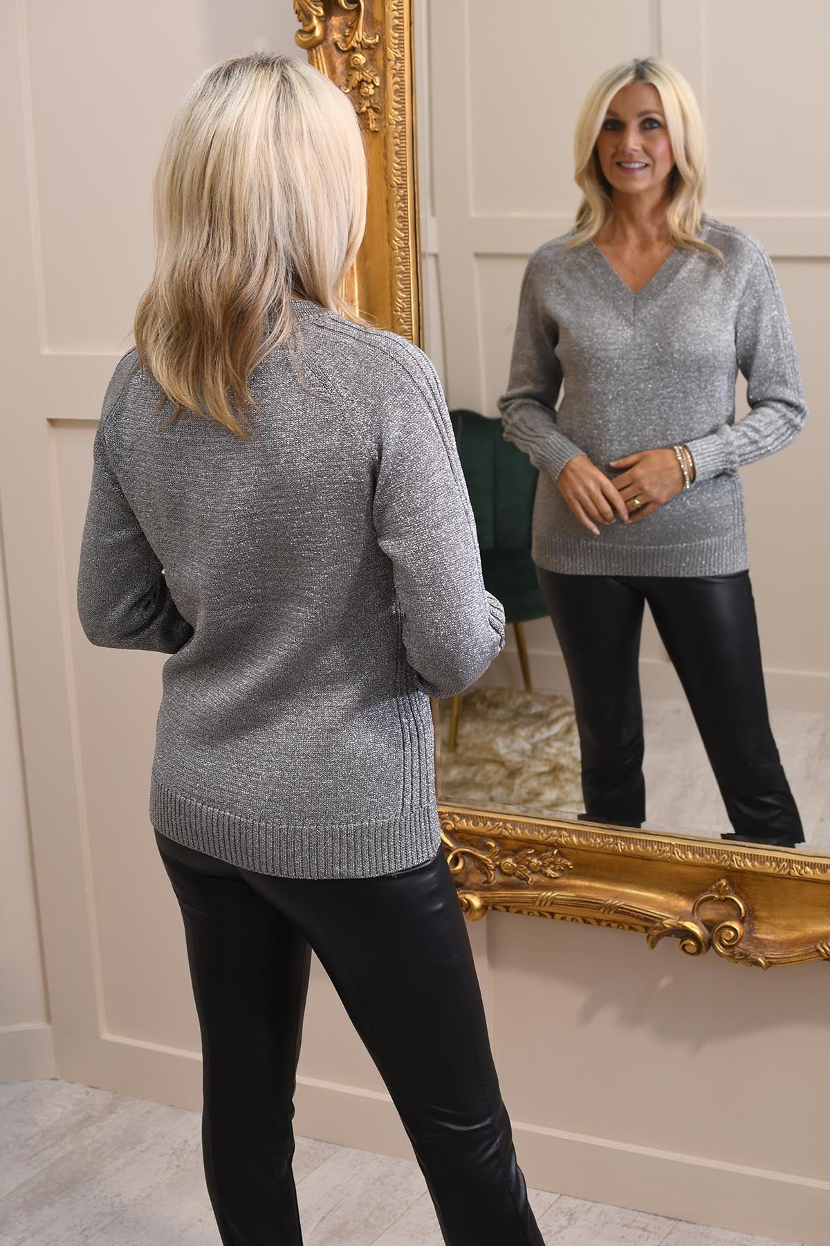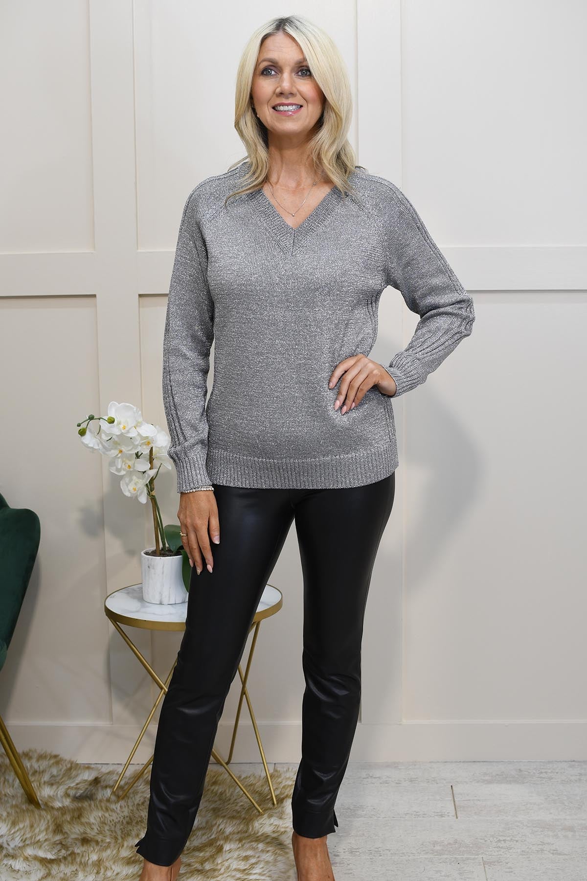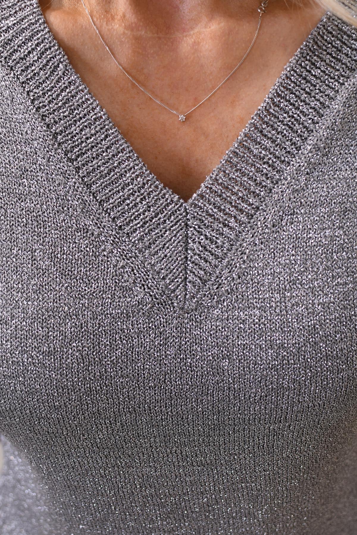 Le pull col V argenté scintillant Pomodoro est un mélange étonnant de confort et de glamour, parfait pour rehausser votre garde-robe. Confectionné dans un tissu doux et confortable, ce pull présente un décolleté en V flatteur qui ajoute une touche de sophistication. La finition argentée scintillante capte magnifiquement la lumière, ce qui en fait un choix idéal pour les sorties décontractées et les occasions plus festives. Sa coupe décontractée assure une liberté de mouvement, tandis que la brillance subtile apporte une touche élégante à votre style quotidien. Associez-le à un jean pour un look chic en journée ou habillez-le avec une jupe pour une soirée, et profitez de la polyvalence et de l'éclat que ce pull apporte à n'importe quelle tenue.