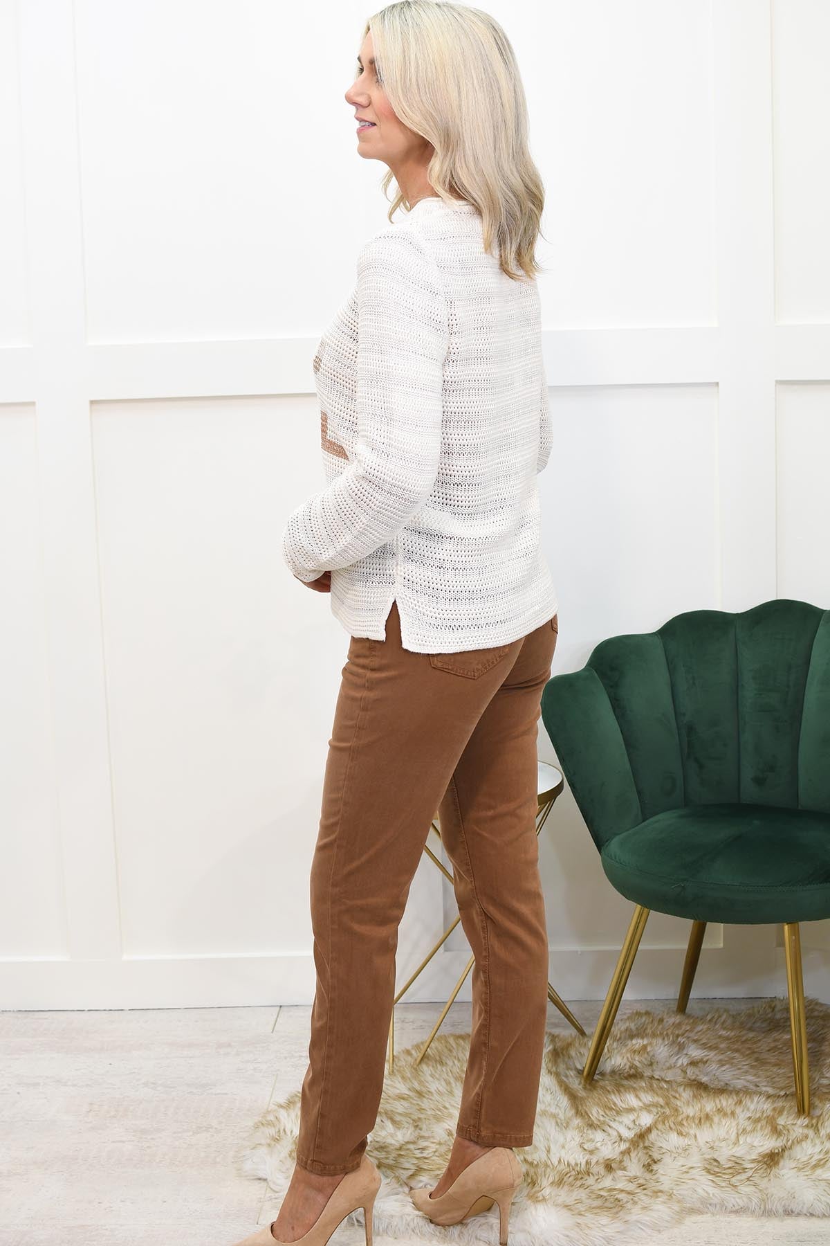 Notre mannequin Rhonda porte une taille 10 et mesure 1,68 m.