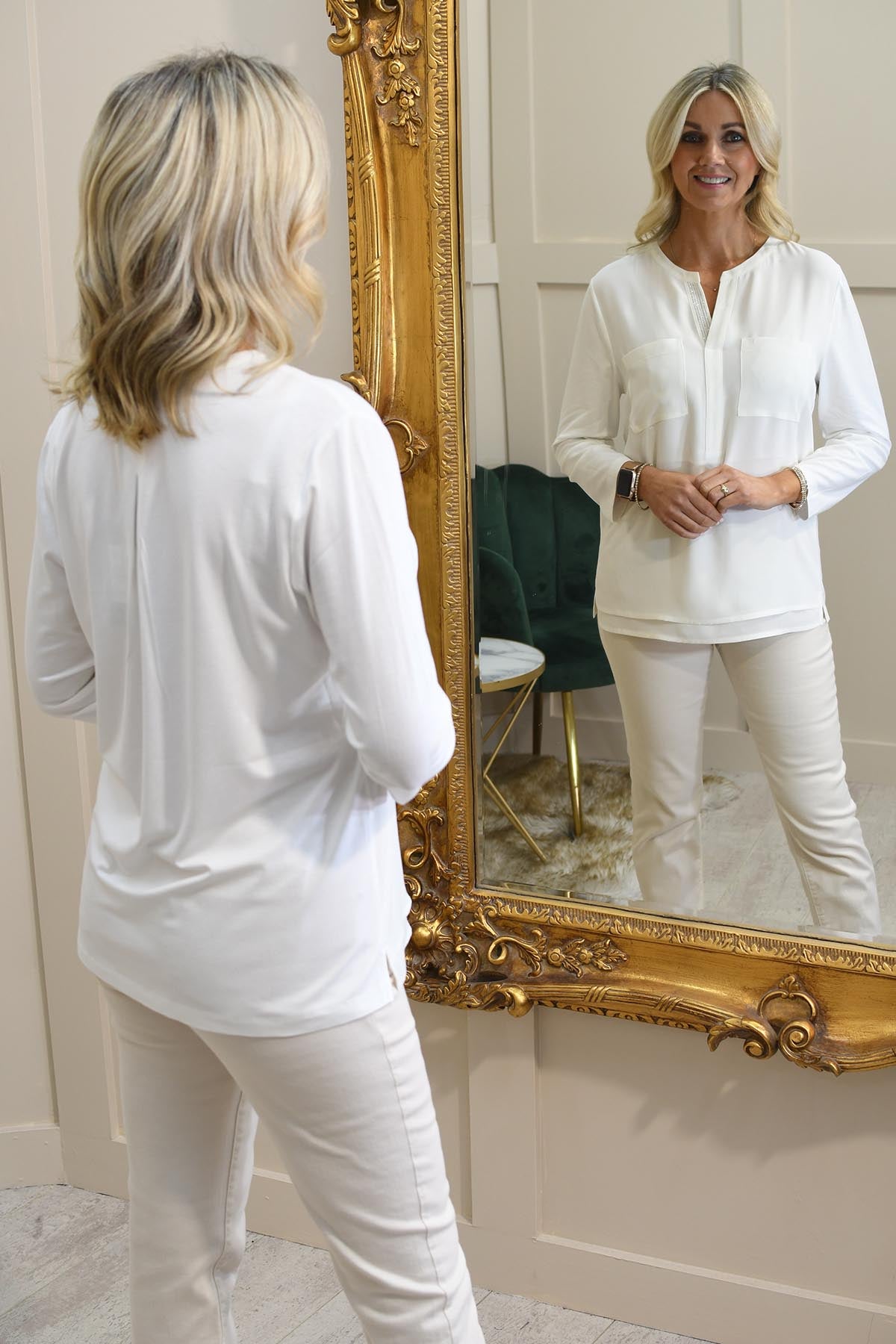 Elevate your wardrobe with the Rabe Cream Sheer Blouse With Diamante Detail a perfect blend of elegance and sophistication. Crafted from a lightweight, semi-sheer fabric, this blouse offers an effortlessly flowy and feminine silhouette. The subtle diamante embellishments add a hint of sparkle, making it ideal for both casual and dressy occasions. Designed with a classic round neckline, long sleeves, and a relaxed fit, it pairs beautifully with tailored trousers or jeans for a chic, polished look. Whether for a daytime outing or an evening event, this versatile blouse adds timeless charm to any ensemble.