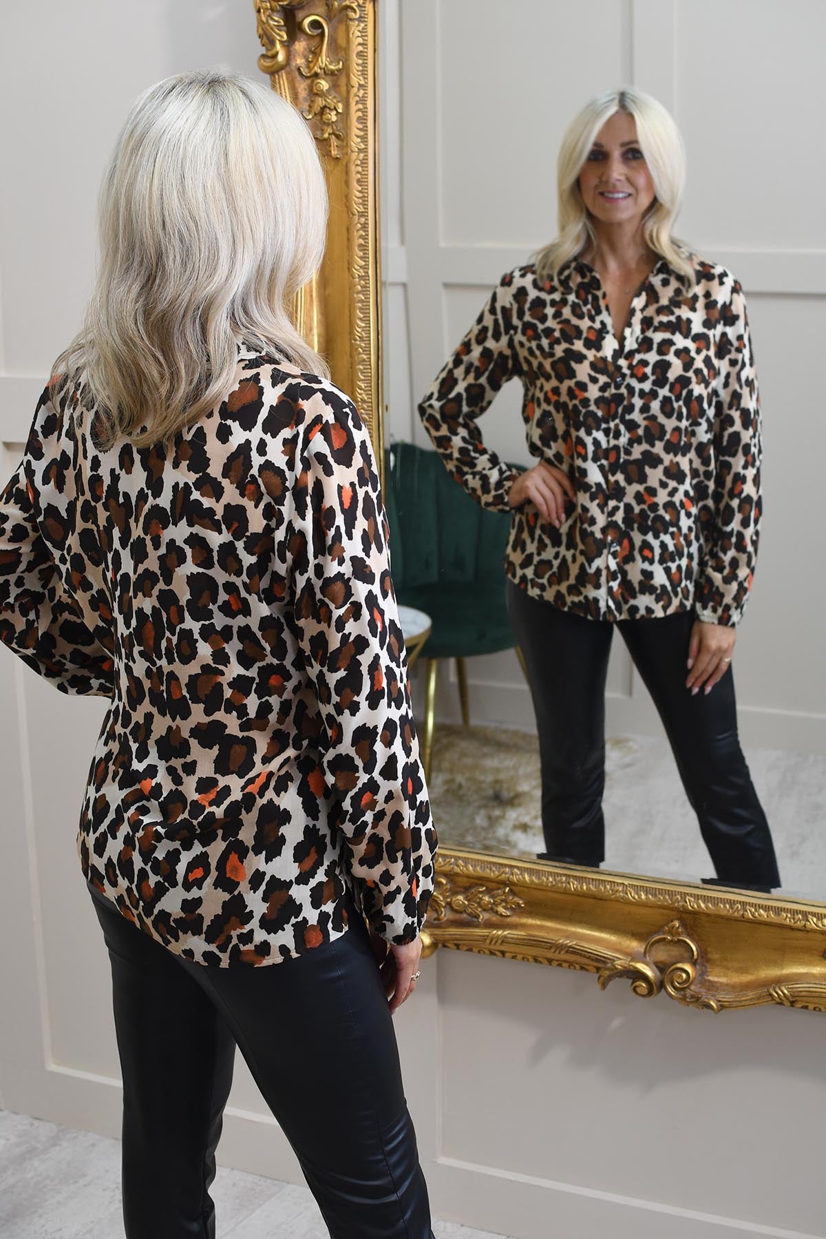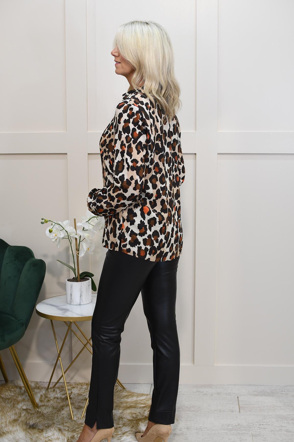 Fabriquée à partir d'un tissu doux et de haute qualité, cette blouse offre une coupe confortable et flatteuse, ce qui la rend idéale à porter toute la journée. L'imprimé léopard classique est rendu dans des tons riches et terreux, donnant à la blouse un attrait intemporel qui passe facilement du jour à la nuit.