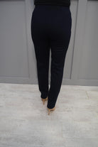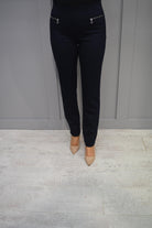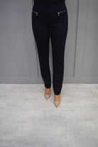Rehaussez votre garde-robe chic et décontractée avec ce superbe pantalon bleu marine Modern Mimi avec fermeture éclair sur le devant de Robell. Ce pantalon slim confortable est confectionné dans un tissu bleu marine de haute qualité. Avec une taille haute et deux poches zippées argentées sur le devant, ce pantalon bleu foncé est polyvalent, intemporel et flatteur.