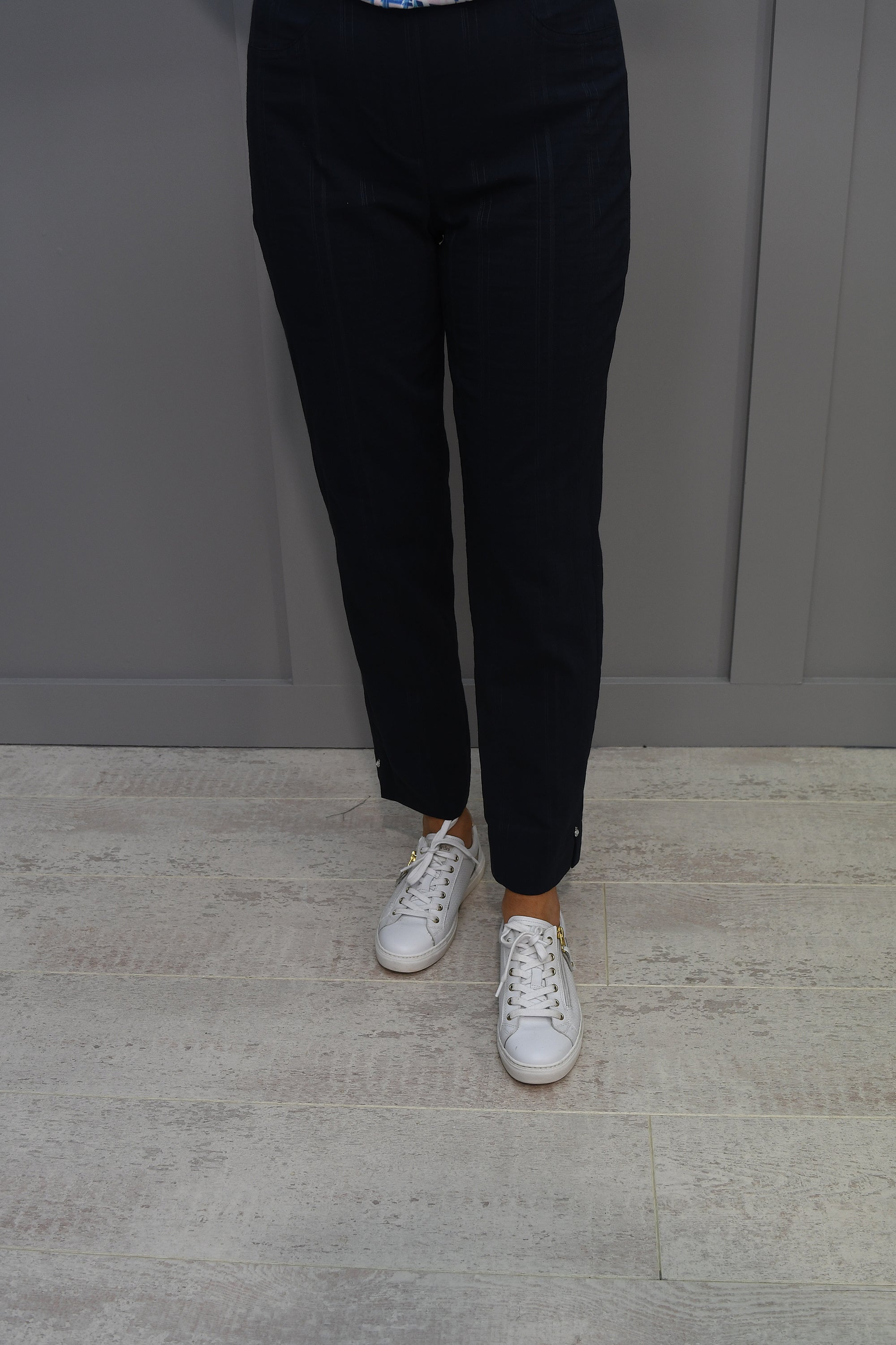 Ce pantalon polyvalent de Robell est un incontournable pour votre garde-robe toute l'année ! Le pantalon en seersucker bleu marine Bella est aussi confortable que polyvalent, coupé dans un tissu bleu marine foncé avec une taille haute et des jambes jusqu'à la cheville. Ce pantalon foncé est conçu pour aller bien avec n'importe quel haut et présente une petite fente à chaque cheville avec une décoration en pierre précieuse.