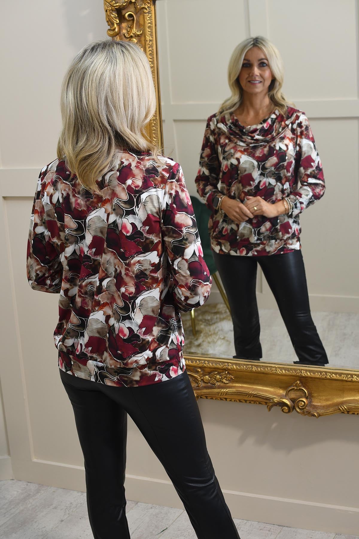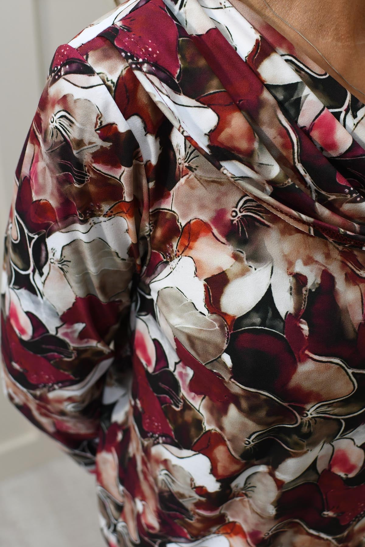 Haut à col bénitier à imprimé floral bordeaux et taupe YEW - 2647 Verity
