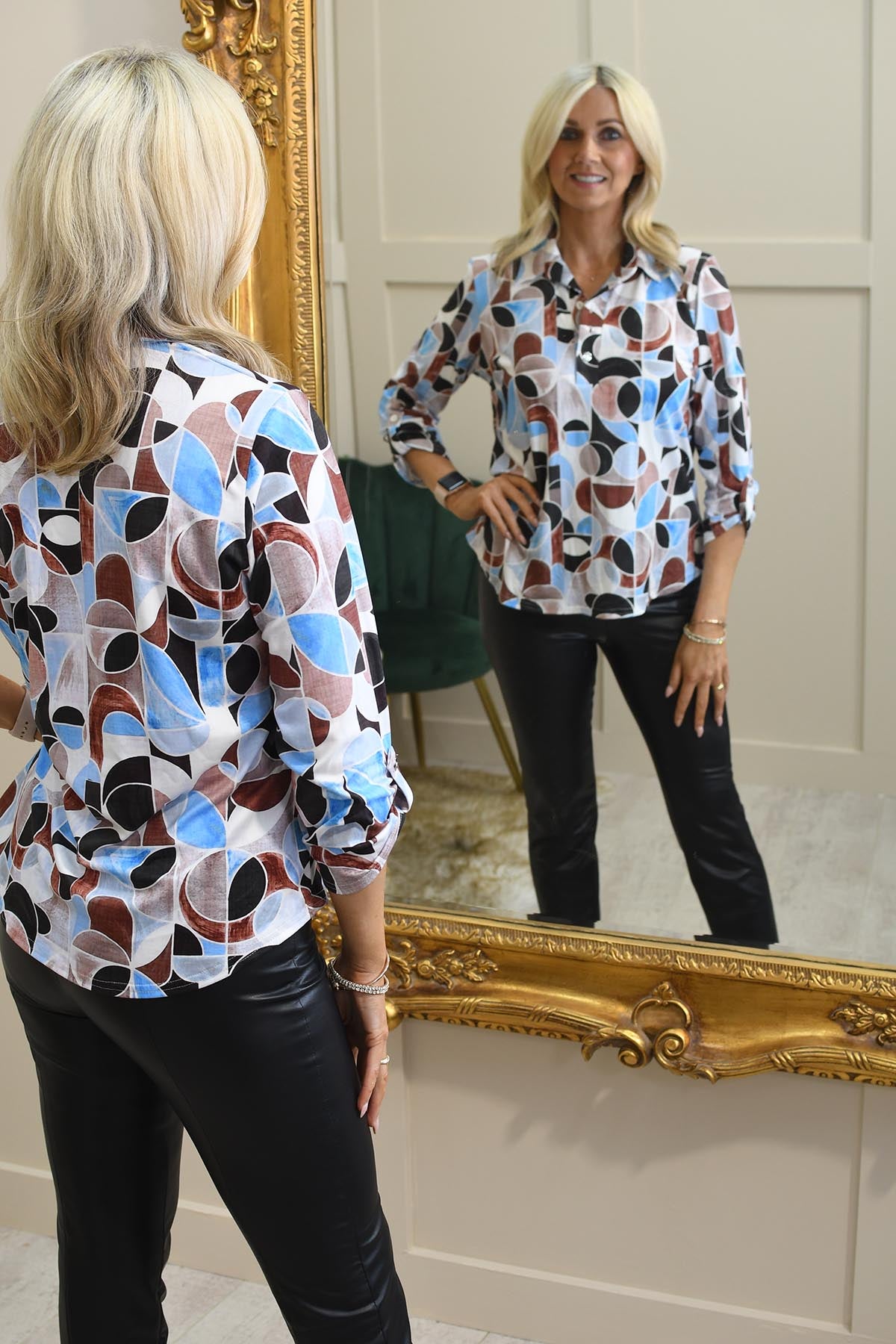 Haut YEW bleu ciel et marron à imprimé géométrique avec bouton 1/4 - 3743 Freda