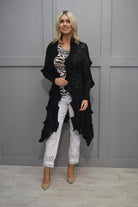 The deep black hue exudes elegance and versatility, making it a timeless addition to any wardrobe. The asymmetrical design of the cardigan creates a contemporary and fashion-forward look, perfect for both casual and more formal occasions.