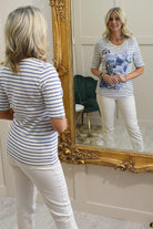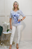 Hit the road in style with the Barbara Lebek Panna Cotta & Navy 'Road Trip' Print Top. Made from a luxurious blend of 60% cotton and 40% modal, this top offers a soft, breathable feel with a smooth, lightweight drape. The panna cotta and navy colour palette is effortlessly chic, while the eye-catching ‘Road Trip’ graphic print adds a fun, adventurous touch. Designed with a classic round neckline and three-quarter sleeves, it’s perfect for casual days out or relaxed weekends. Pair it with jeans or trousers for a stylish and comfortable everyday look.