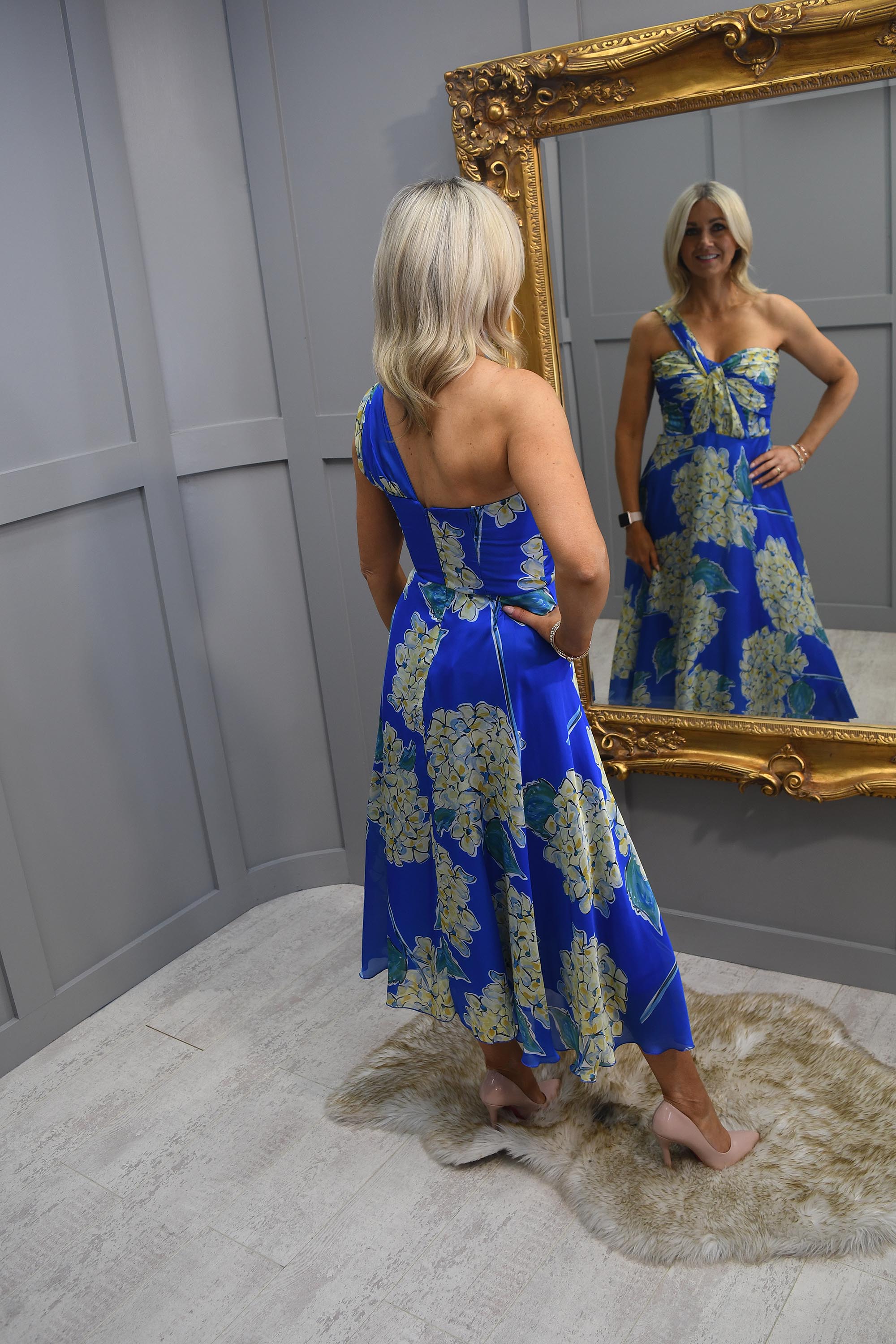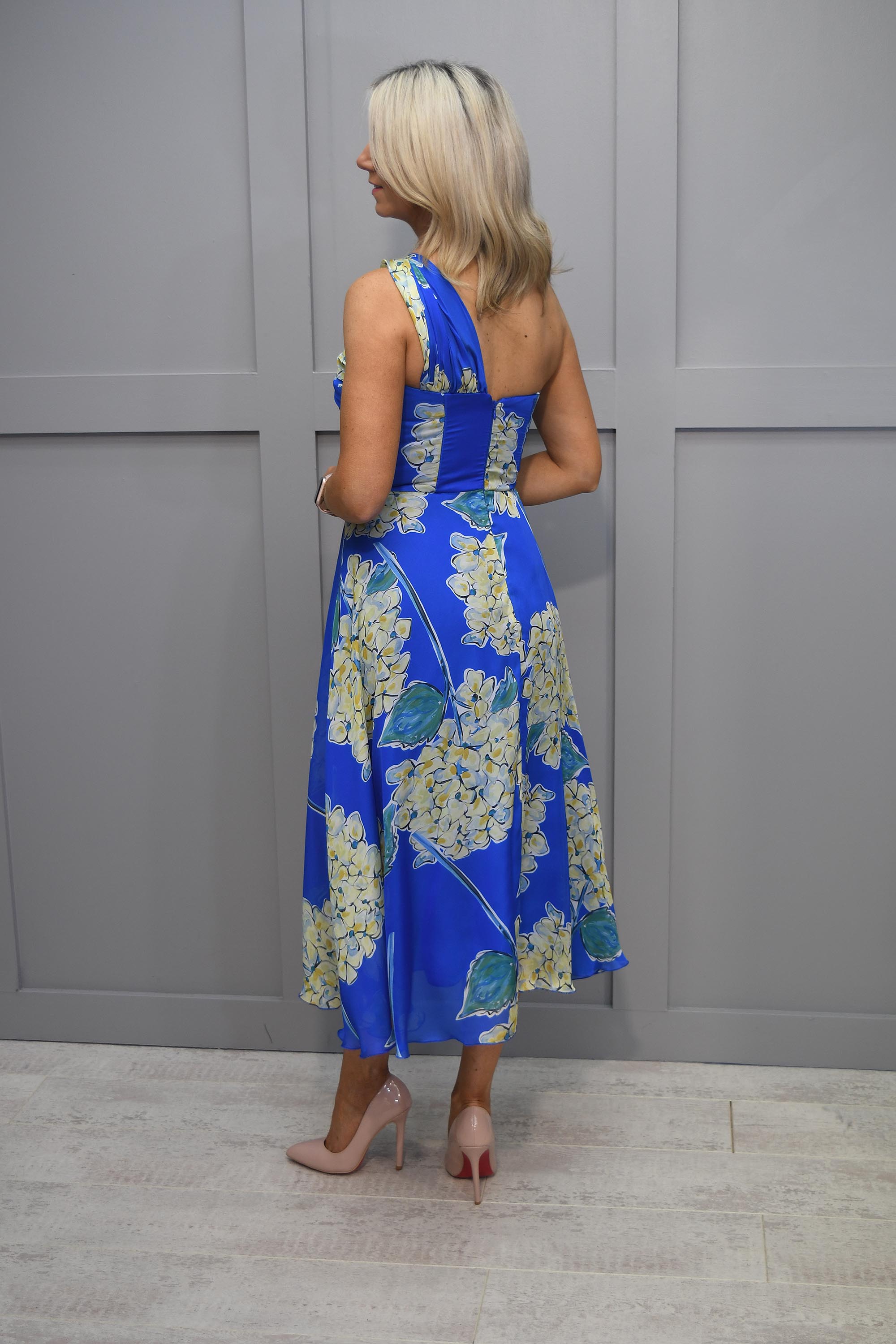 Carla Ruiz Blue & Yellow Hydrangea Dress With One Shoulder Detail - 50644