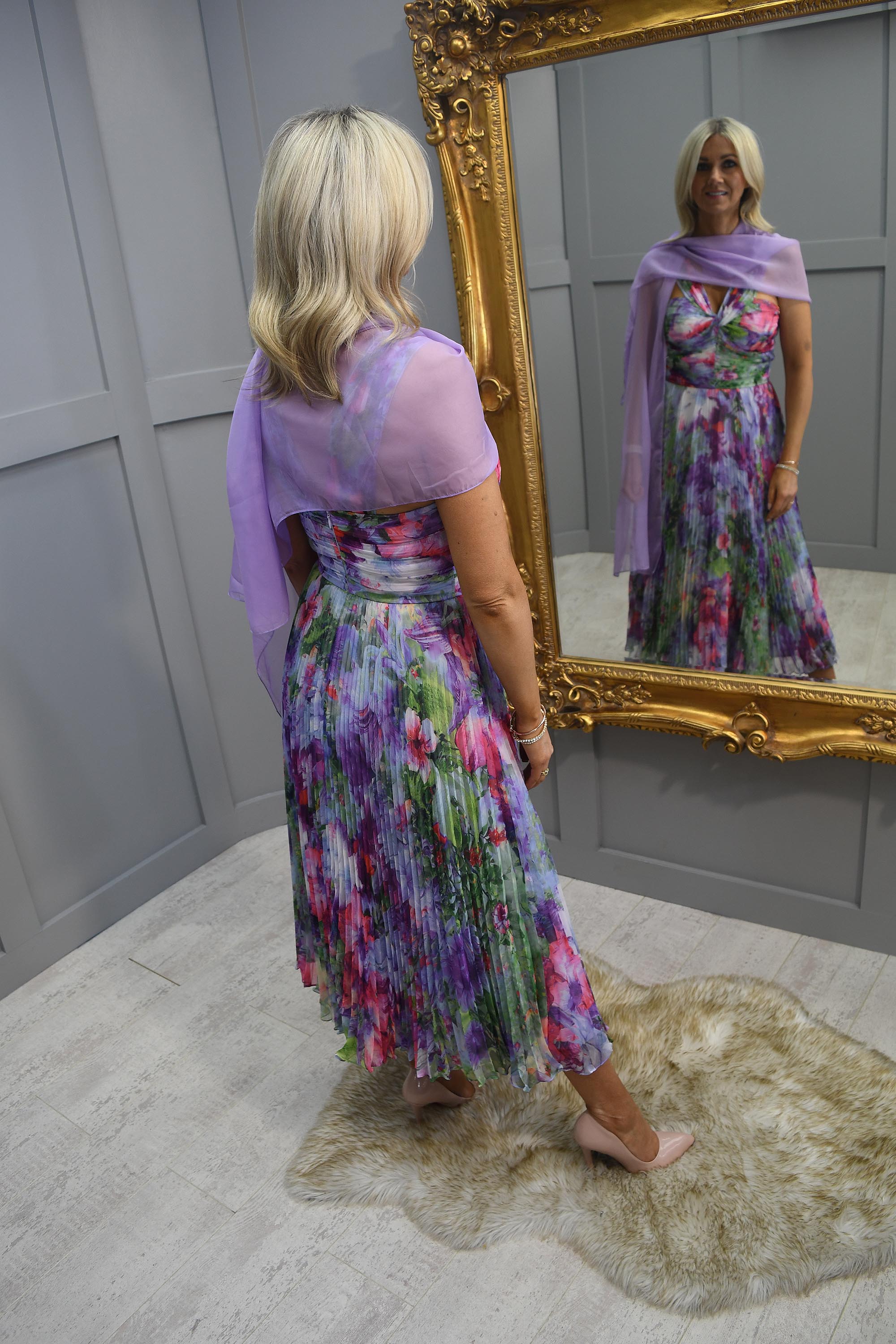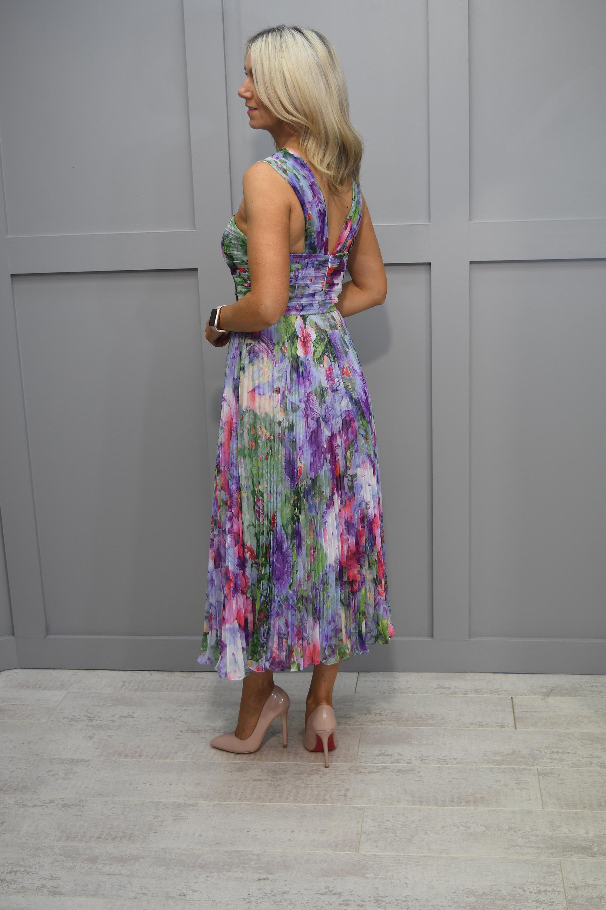 Carla Ruiz Floral Pleat Dress With Cross Strap & Lilac Shawl-50407