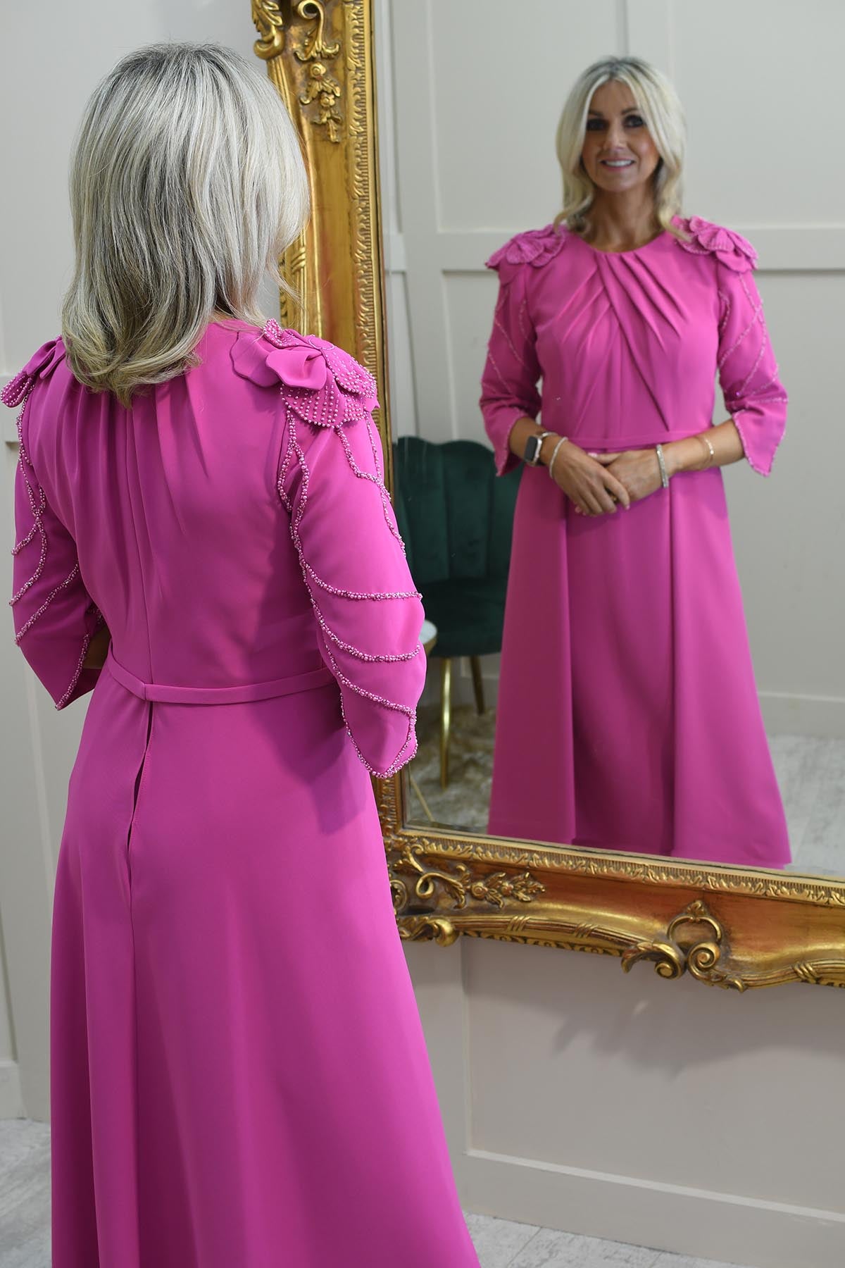 The Couture Club Fuchsia Cape Dress with Embellished Floral Shoulders is a stunning choice for any special occasion, including mother of the bride events. This luxurious dress features a bold fuchsia colour, creating a striking and elegant look. The cape design adds a modern twist, while the embellished floral shoulders provide a touch of glamour and sophistication. Crafted with attention to detail, this dress offers a flattering, feminine silhouette that exudes confidence and grace. Perfect for wedding celebrations or formal occasions, the Couture Club dress ensures you'll make a lasting impression. A must-have for mothers of the bride seeking elegance and style.