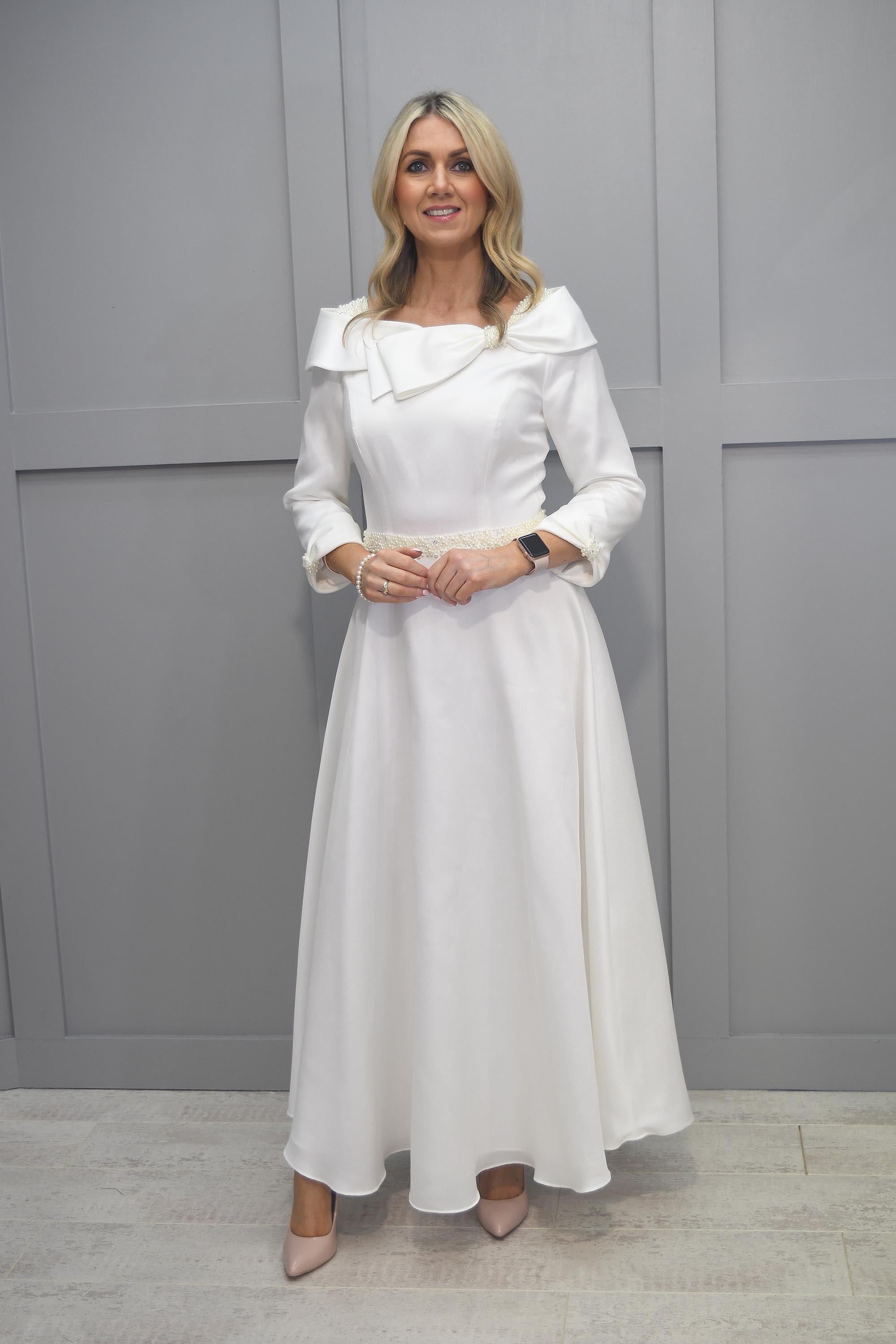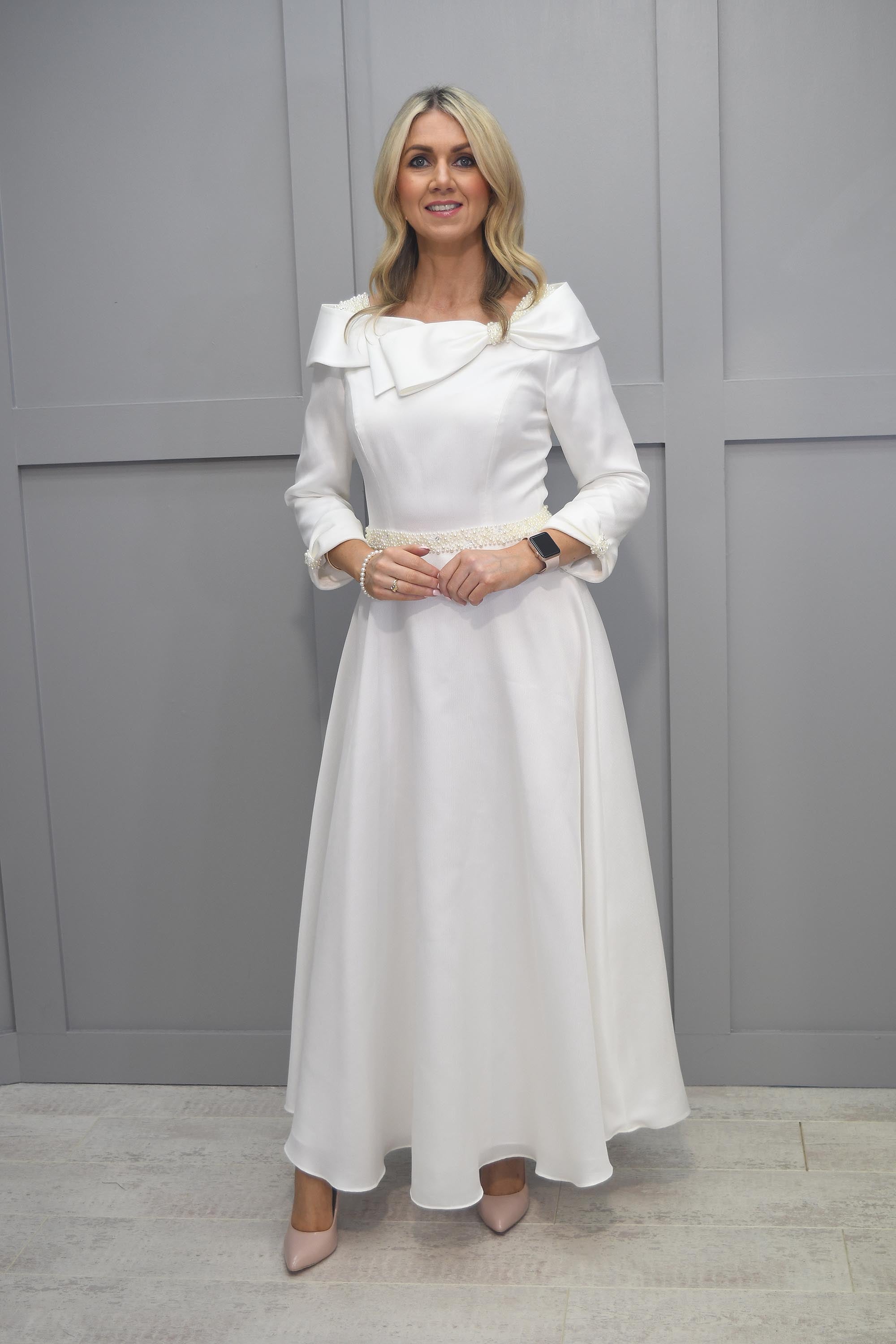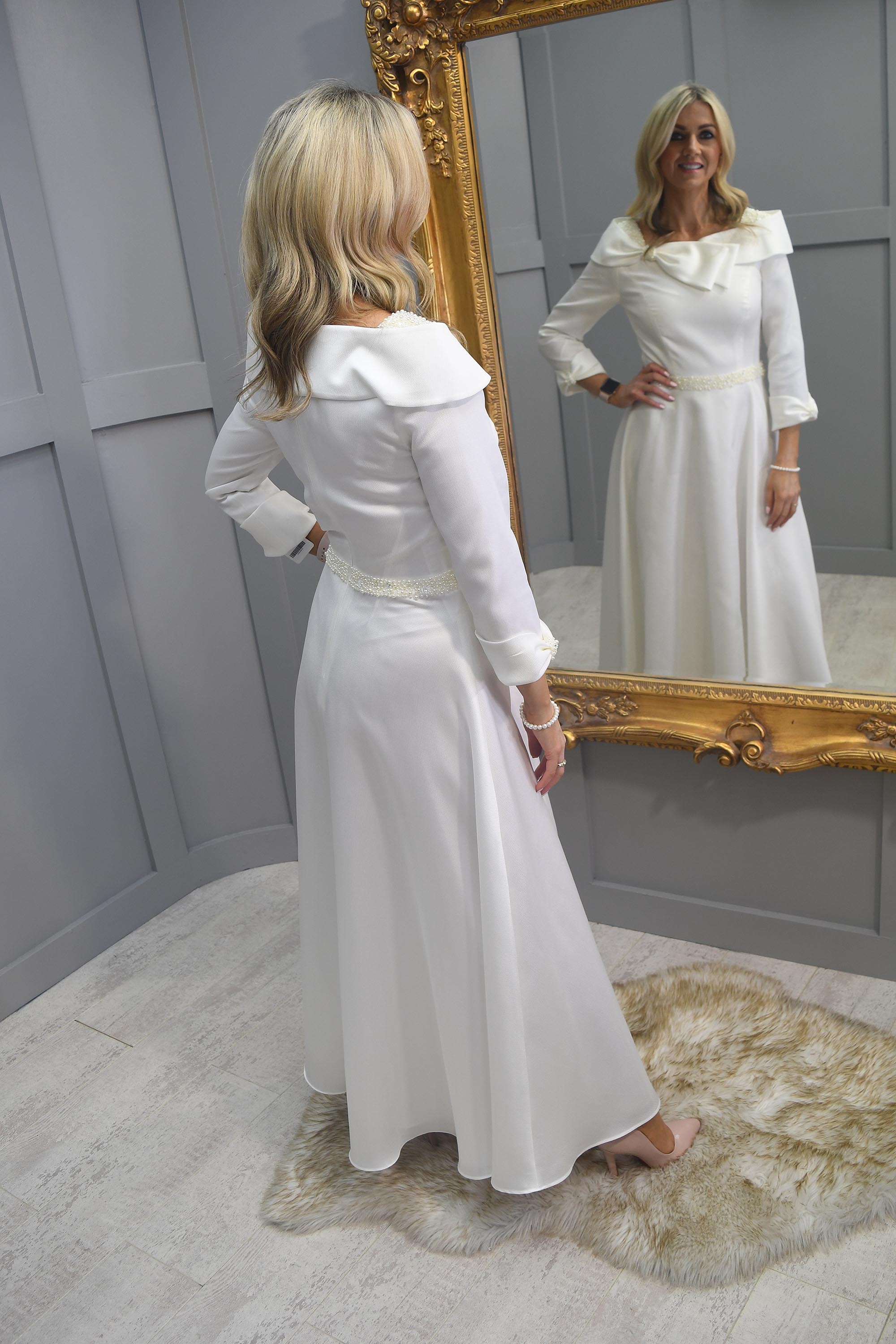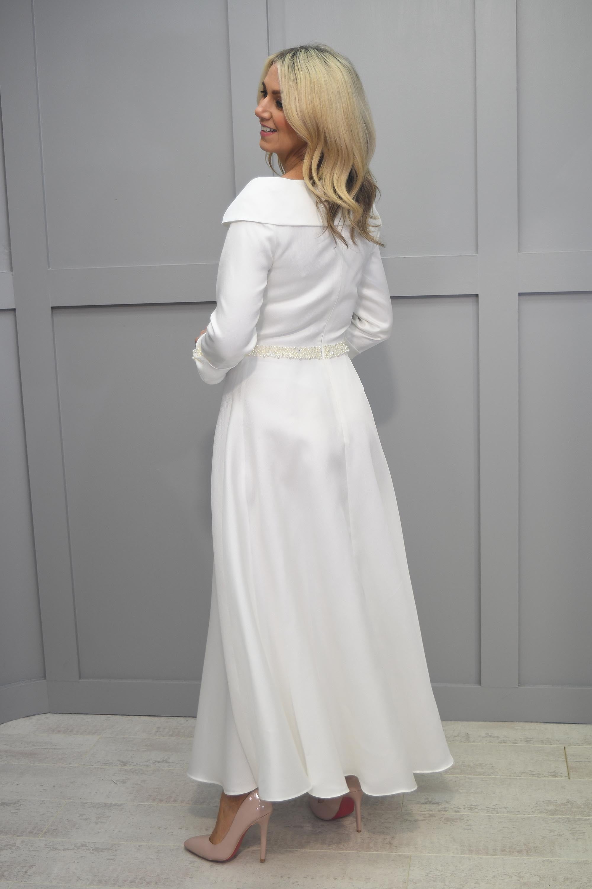 This ethereal dress from Couture Club is perfect for christenings or makes a unique look for fashion-forward brides. The Ivory Dress With 3/4 Sleeve, Bow Detail & Pearl Detail is crafted from luxurious materials, with a full-length chiffon skirt and silky long-sleeve top. Pretty pearl detailing adorns the cuffs, A-line waist and dramatic neckline, which is decorated with an oversized bow.