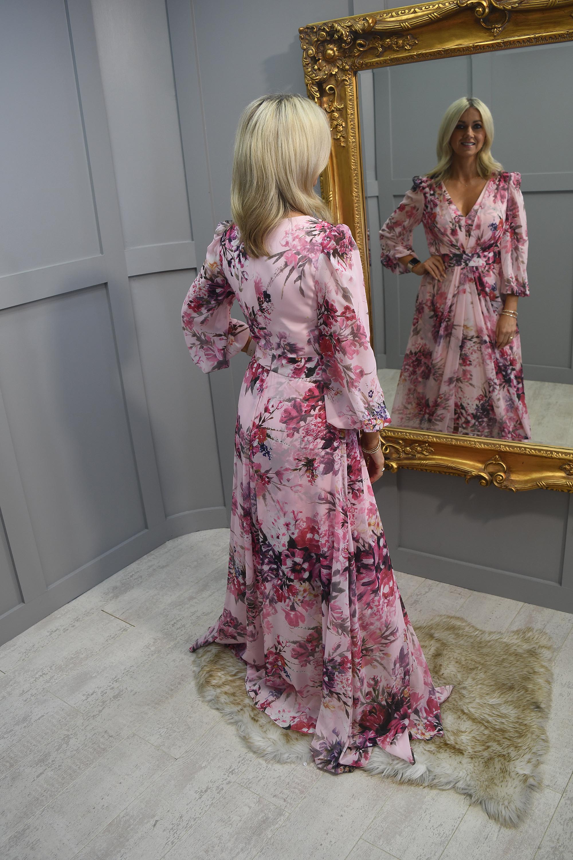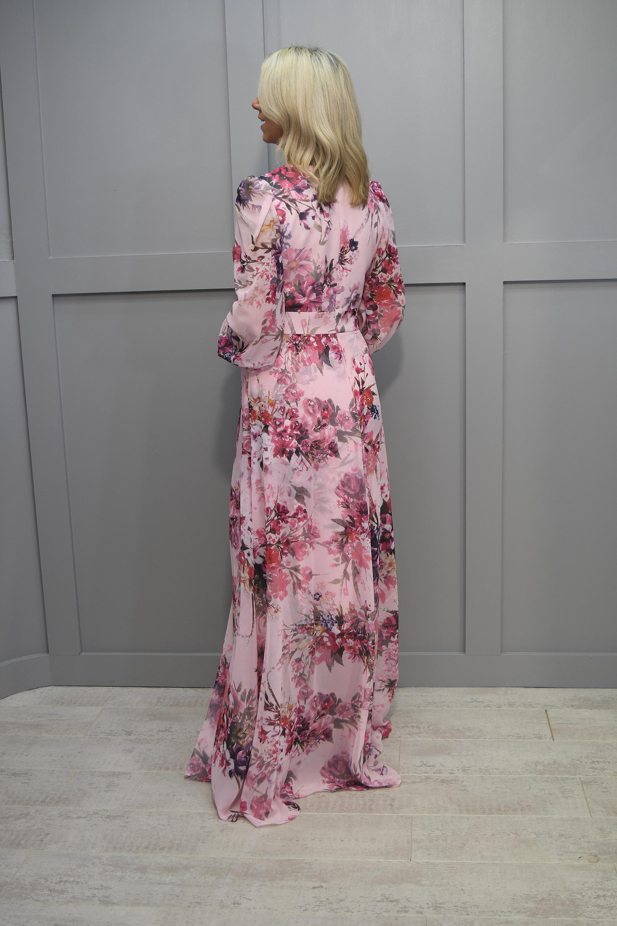 Crafted with meticulous attention to detail, this dress is a testament to couture craftsmanship. The soft pink hue imbues the fabric with a delicate charm, reminiscent of cherry blossoms in full bloom. Against this backdrop, an intricate floral print blossoms, each petal and stem rendered with a painter's precision.