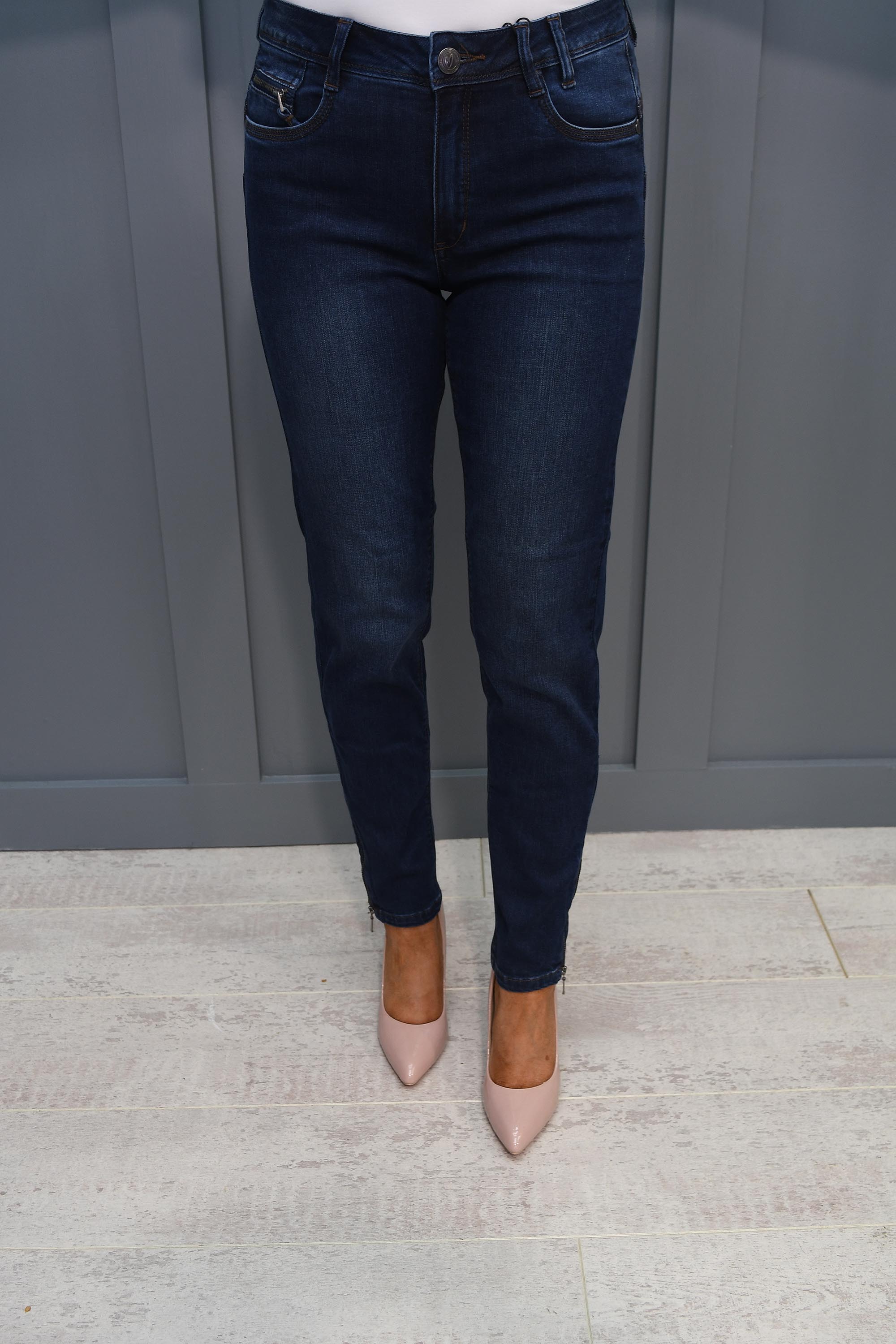 The straight legs of these classic blue jeans are adorned with a cool zip on the side, adding a trendy twist to the timeless design. This detail elevates the jeans from basic to standout, showcasing your attention to fashion-forward choices.