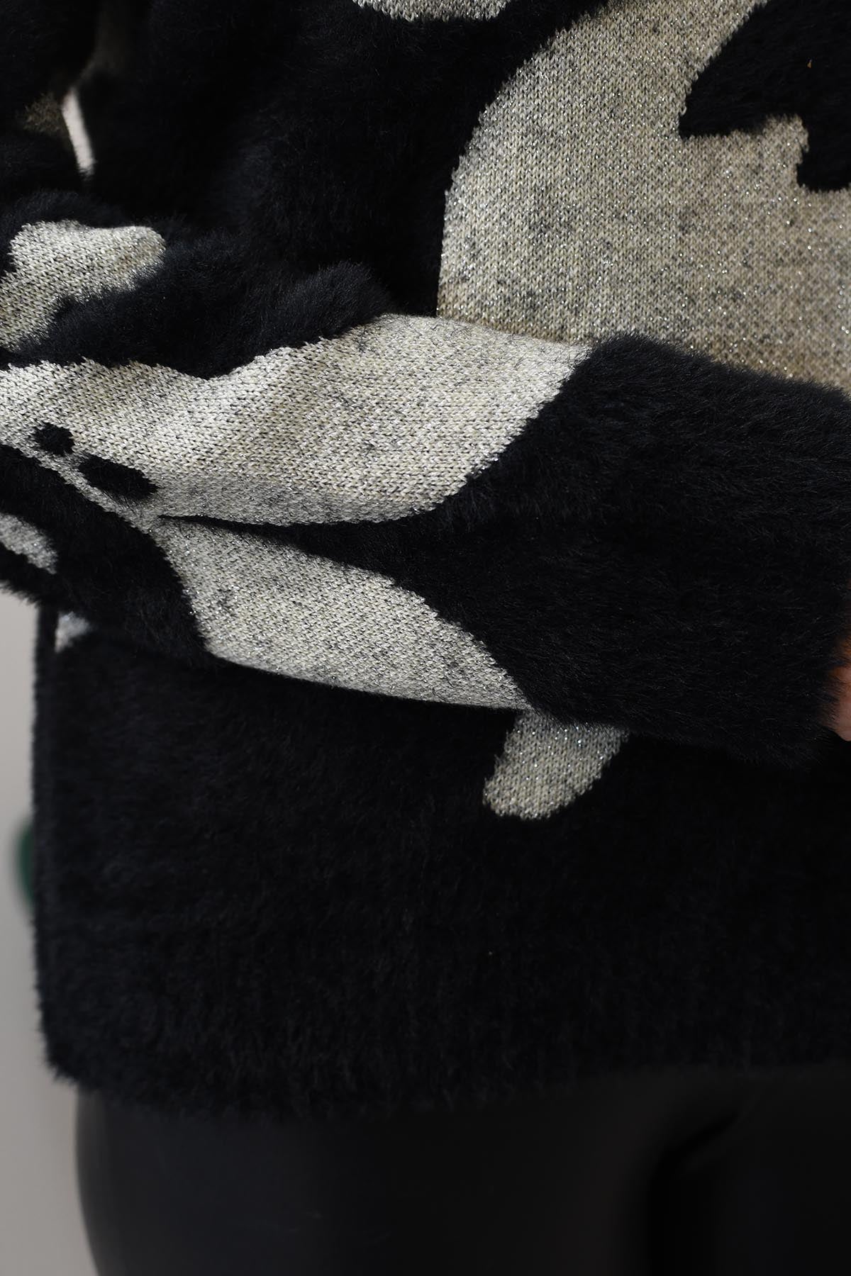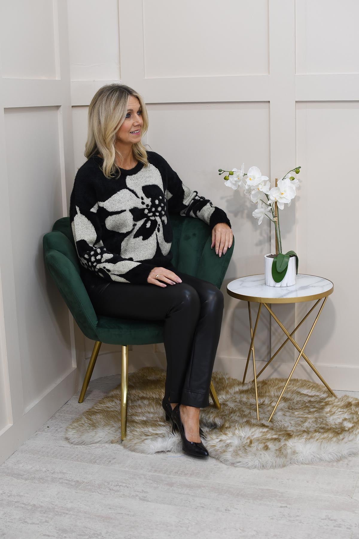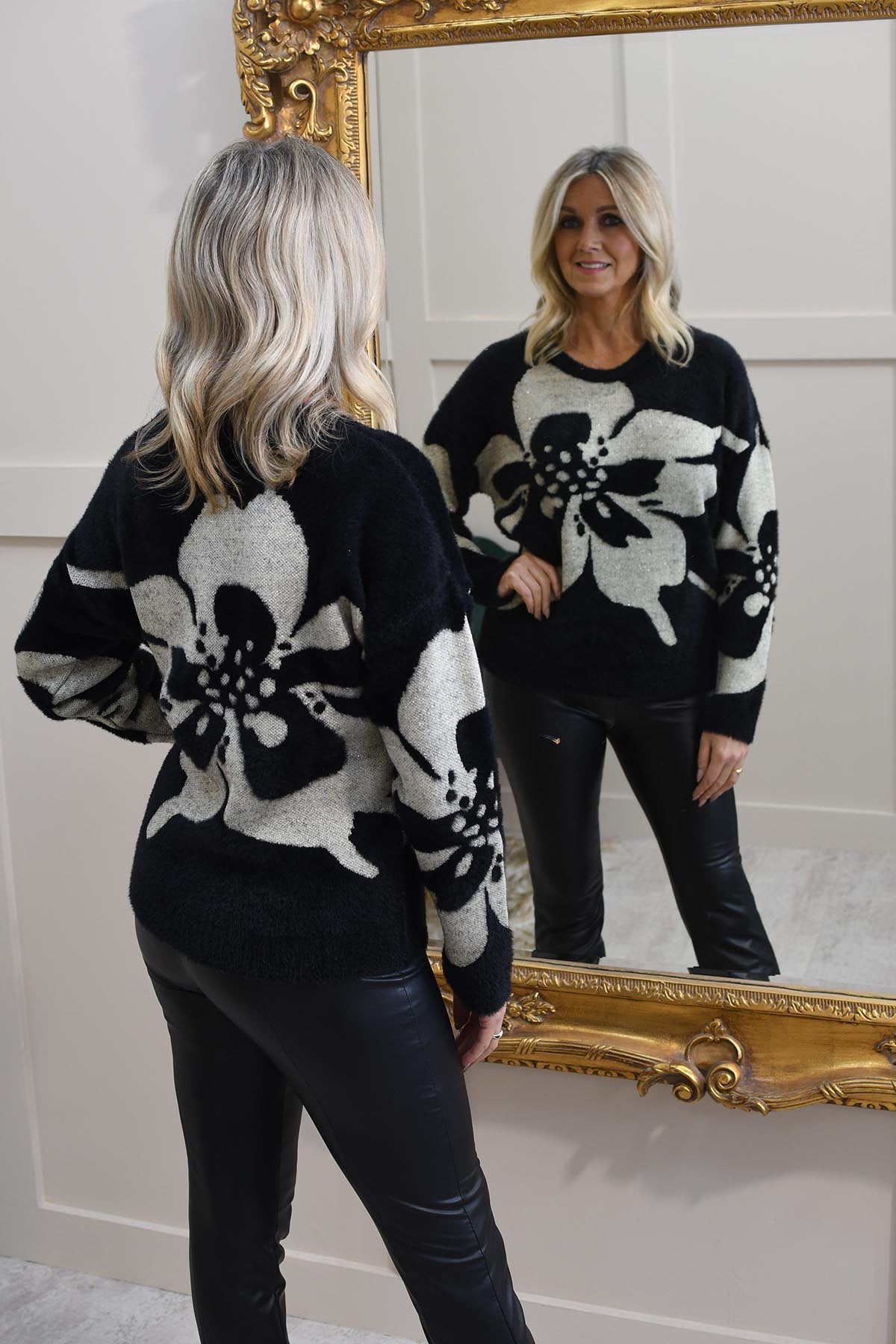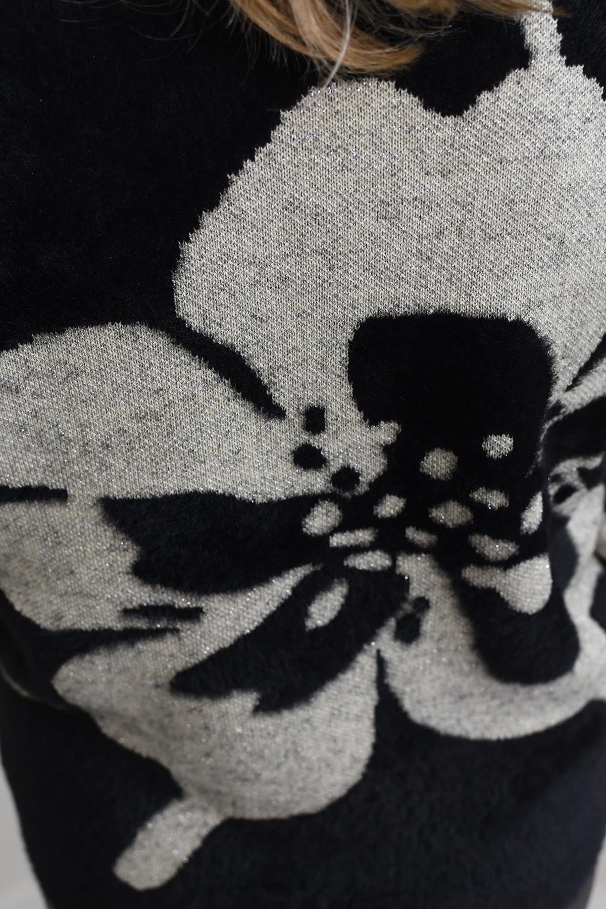 This black bold oversized jumper features an eye-catching flower motif that adds a statement touch to your wardrobe. Crafted from a premium blend of 50% polyamide, 20% cotton, 20% acrylic, and 10% metallised yarn, it offers both comfort and subtle shimmer. The oversized fit drapes effortlessly, creating a relaxed yet stylish silhouette perfect for layering. Soft to the touch with a hint of sparkle, this jumper combines cosy warmth with contemporary design. Ideal for elevating everyday looks, it pairs beautifully with jeans or tailored trousers for a chic, fashion-forward finish that stands out in any season.