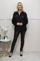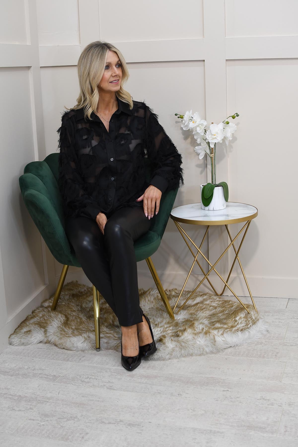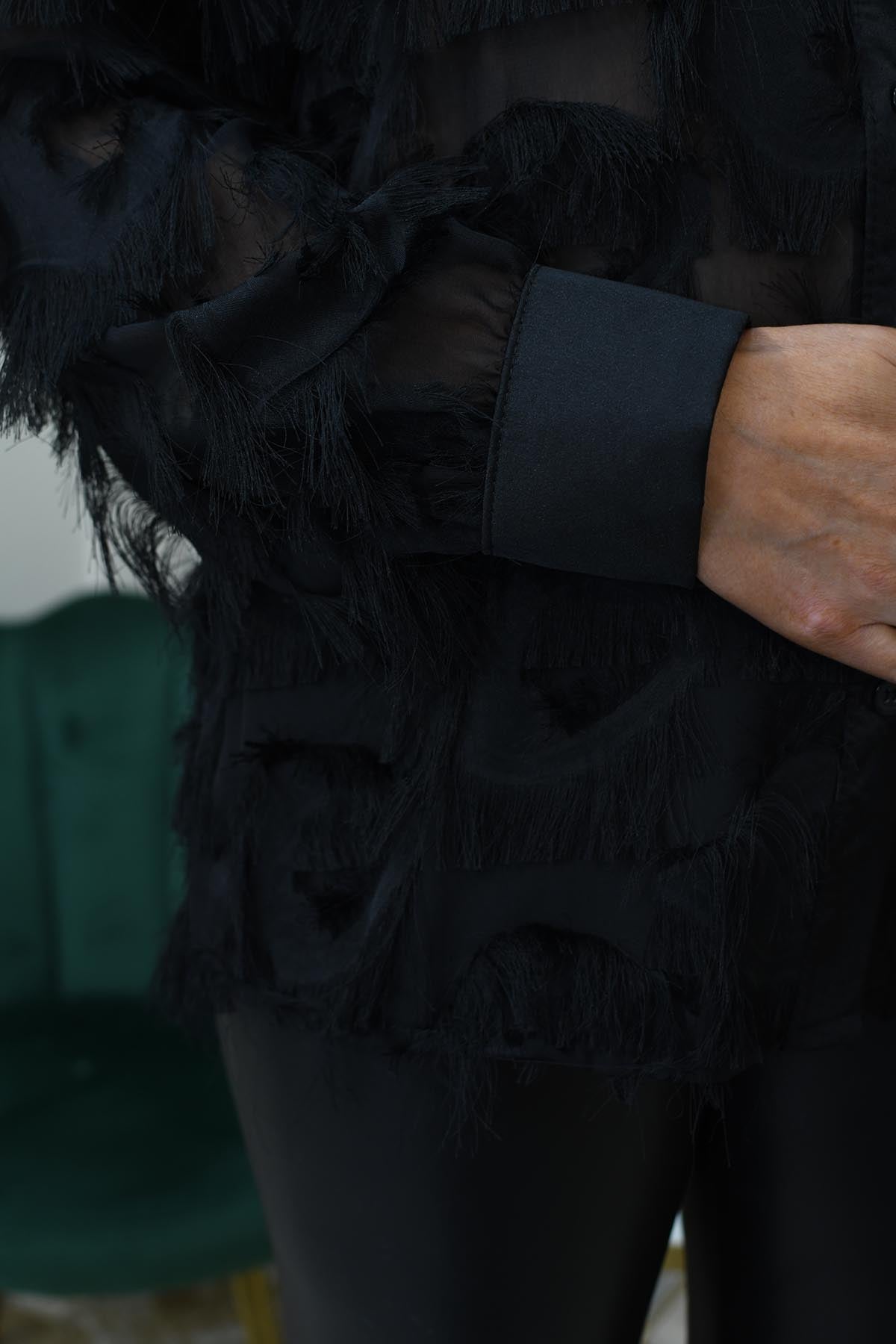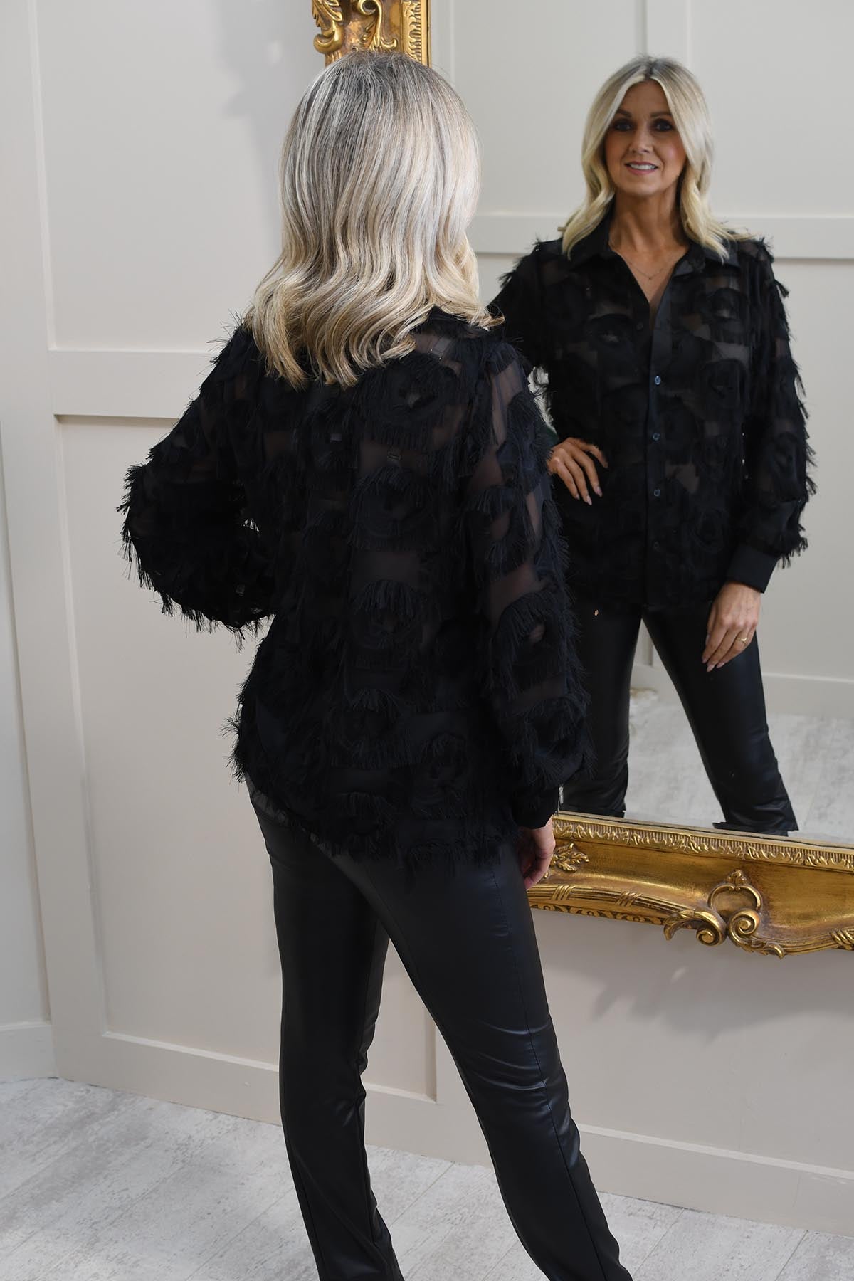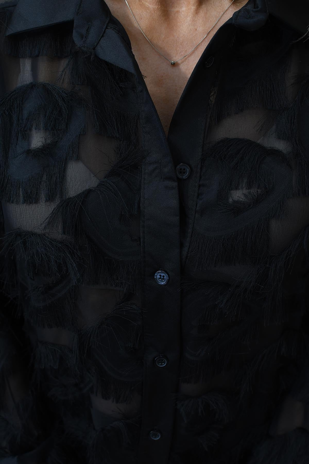 Make a statement with the Decollage Sheer Fringe Shirt in classic black, a piece that blends sophistication with playful movement. Crafted from 100% polyester, it offers a lightweight, sheer finish that drapes effortlessly for a chic, modern look. The fringe detailing adds texture and drama, making this shirt perfect for special occasions or evenings out. Style it with tailored trousers, skirts, or sleek denim to create a standout outfit that balances elegance and edge. A versatile wardrobe addition, it’s ideal for women who love unique statement pieces with a contemporary twist on classic tailoring.