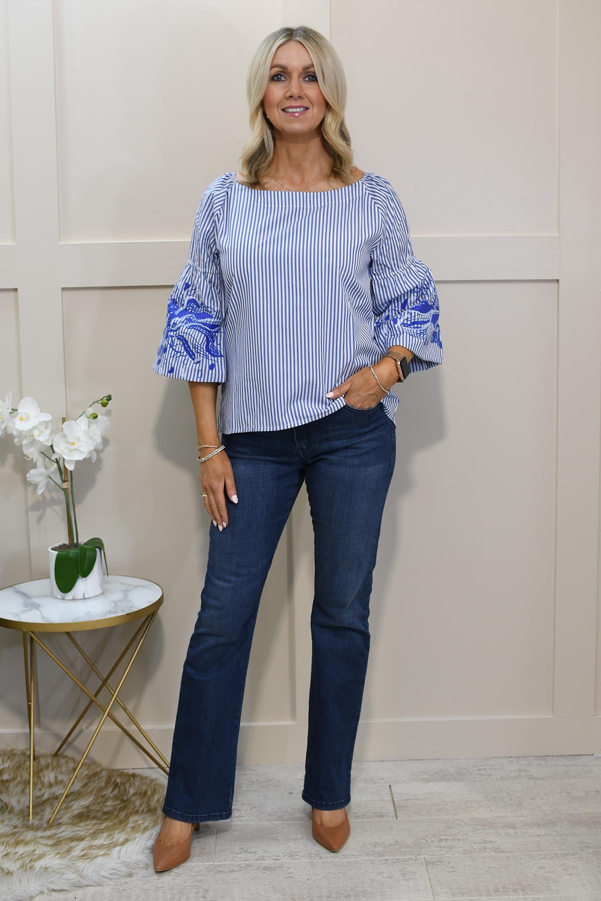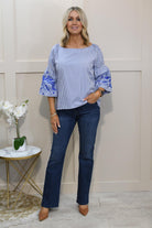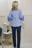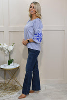Dolcezza Blue Pinstripe Off-Shoulder Blouse With Floral Bell Sleeves-25155
