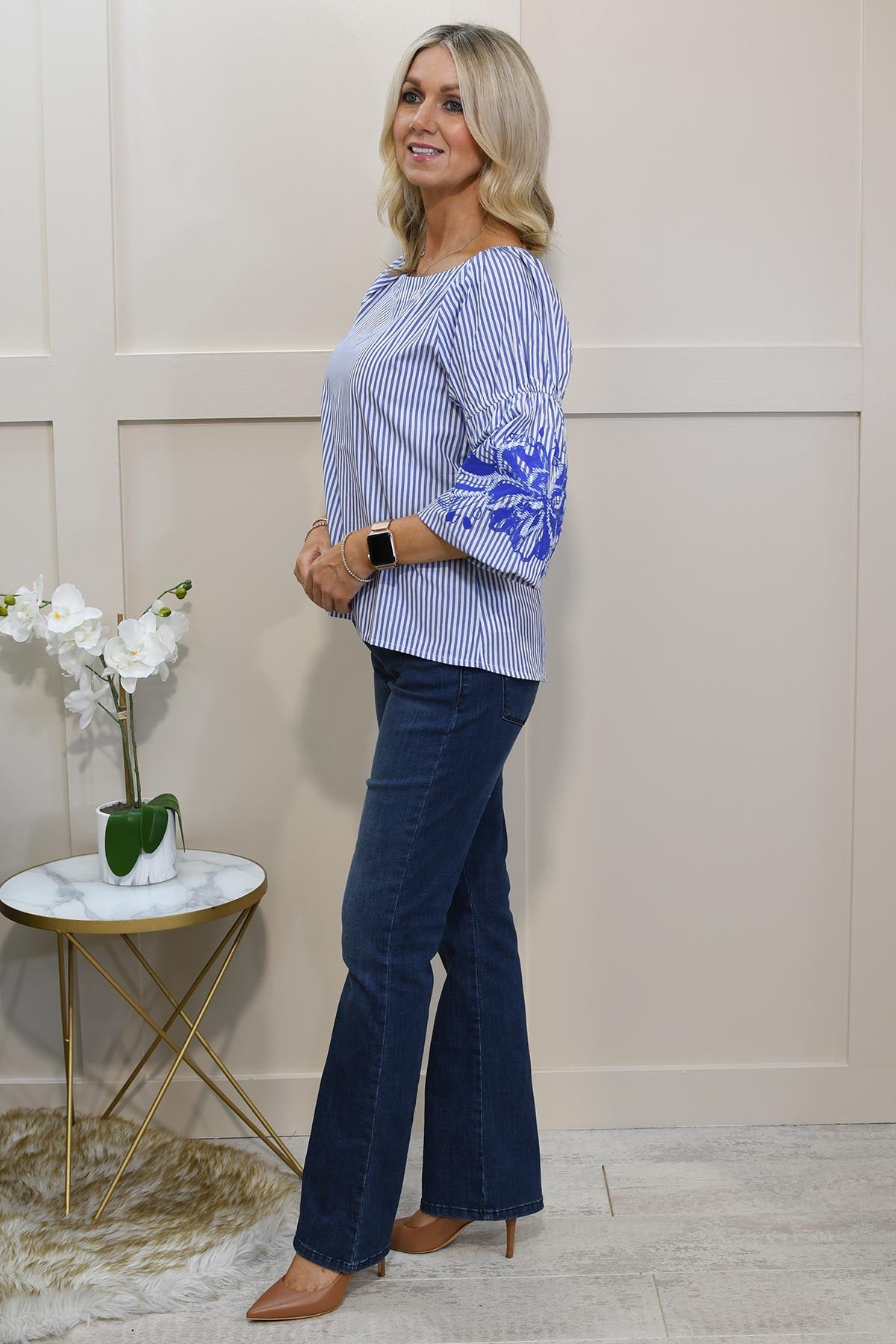 Step into effortless elegance with the Dolcezza Blue Pinstripe Off-Shoulder Blouse With Floral Bell Sleeves. Made from a soft and breathable blend of 55% polyester and 45% cotton, this blouse offers a lightweight feel and comfortable fit. The classic blue pinstripe pattern is elevated by off-shoulder styling, adding a touch of sophistication and femininity. Statement floral bell sleeves bring a romantic, bohemian flair, perfect for dressing up or down. Pair it with tailored trousers for a chic look or with denim for a casual, stylish vibe.