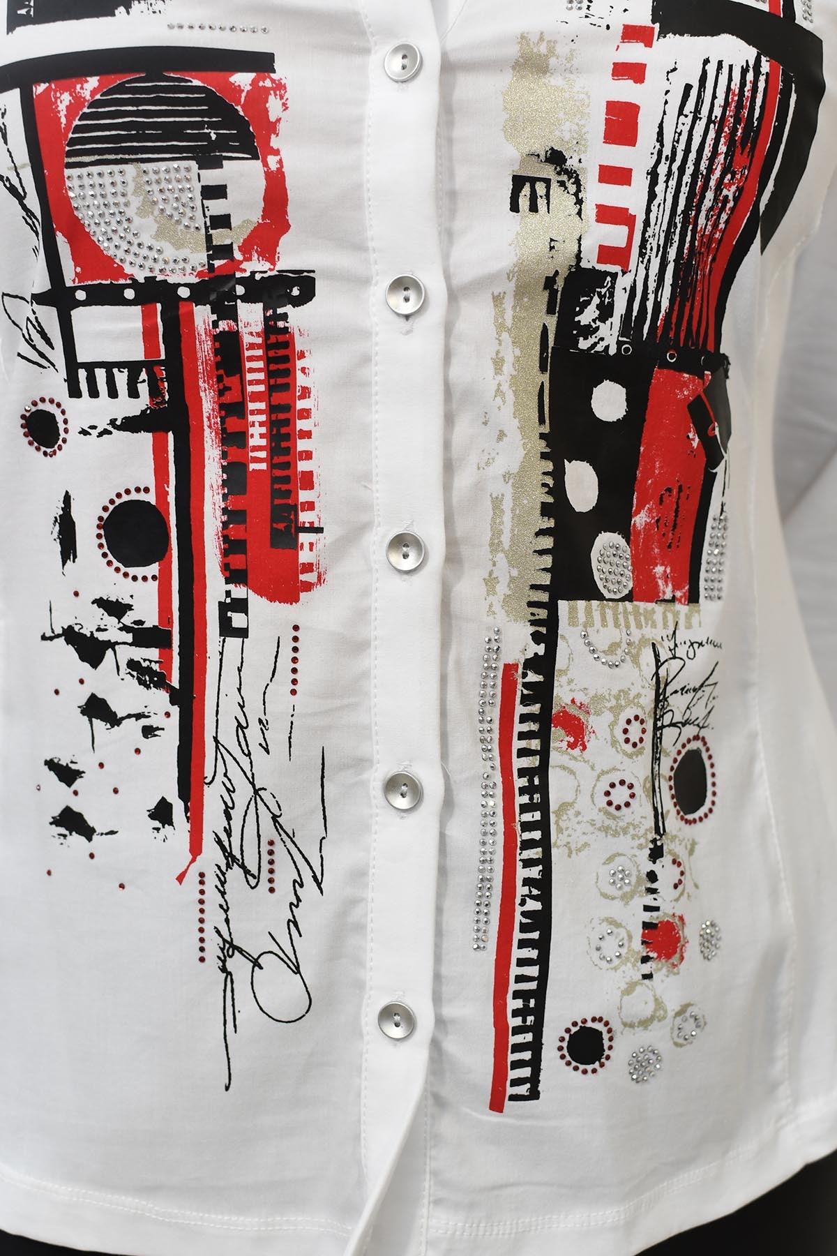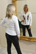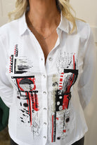 Showcase your artistic side with the Dolcezza Bookworm Abstract Art Shirt, featuring the distinctive work of artist Carol Staub. Crafted from 95% cotton and 5% elastane, it offers breathable comfort with a hint of stretch for a flattering fit. The bold abstract design in red, black, and gold makes a striking statement, while the diamante detail adds subtle sparkle for a touch of elegance. Perfectly balancing art and fashion, this versatile shirt can be styled for smart-casual outings, creative events, or evening occasions. A wearable masterpiece, it’s an essential for women who love unique, expressive, and stylish clothing.