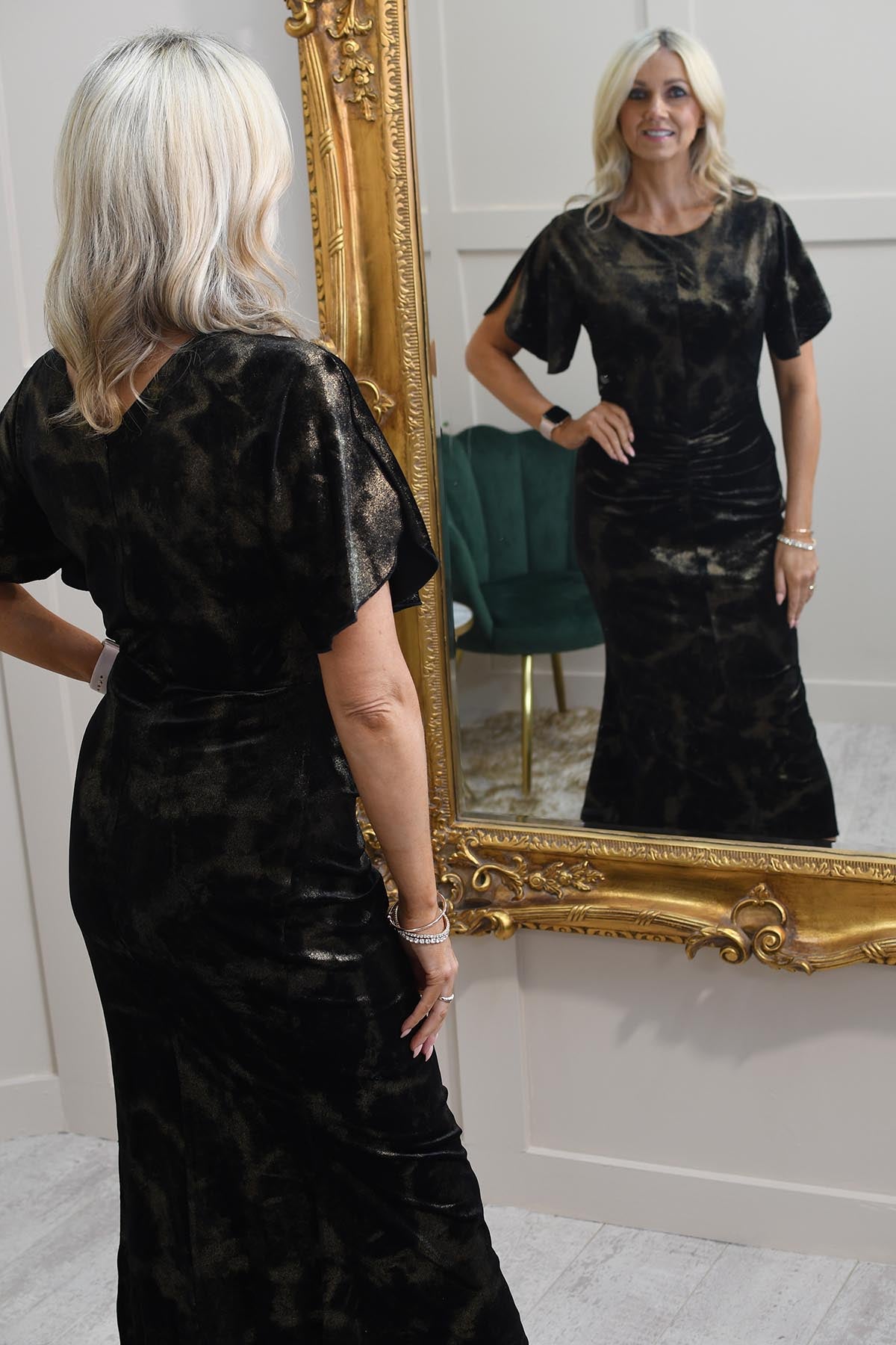 The Girl In Mind Black and Gold Ruched Velvet Midi Dress - Cleo is a stunning and luxurious choice for any special occasion. Crafted from sumptuous black velvet with shimmering gold accents, this dress exudes elegance and sophistication. The ruched detailing along the bodice and waist enhances the figure, creating a flattering, curve-hugging silhouette. Its chic midi length and rich texture make it perfect for evening events or parties, while the combination of black and gold adds a touch of glamour. This dress is ideal for making a bold, stylish statement with timeless allure.