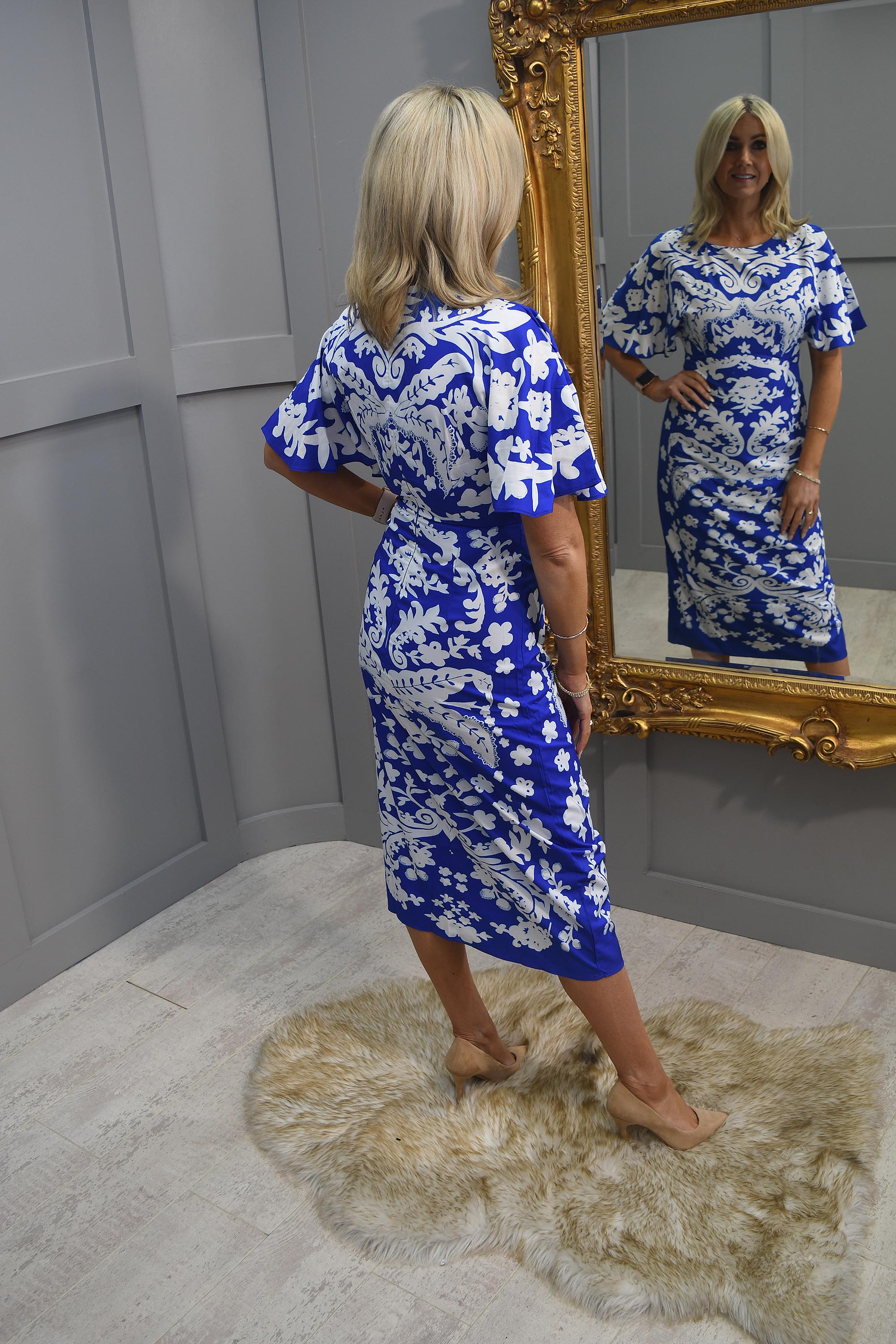 Crafted from a luxurious blend of fabrics, this dress features a striking cobalt blue hue contrasted with crisp white accents, creating a bold and eye-catching look. The midi length adds a touch of refinement, while the tailored silhouette ensures a flattering fit that accentuates your curves in all the right places.