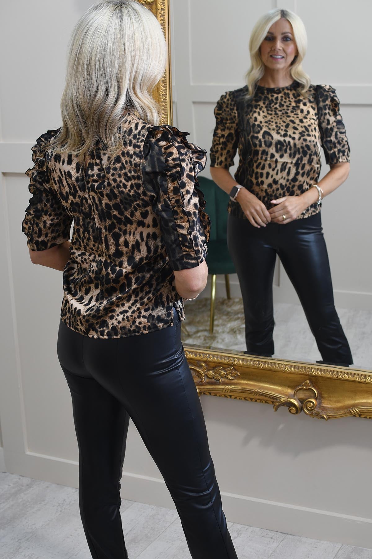 Unleash your wild side with the Girl In Mind Leopard Print Frill Sleeve Top - Asher, a chic and playful piece that adds a touch of fierce fashion to any outfit. This top features a bold leopard print that never goes out of style, making it a must-have for those who love to make a statement.