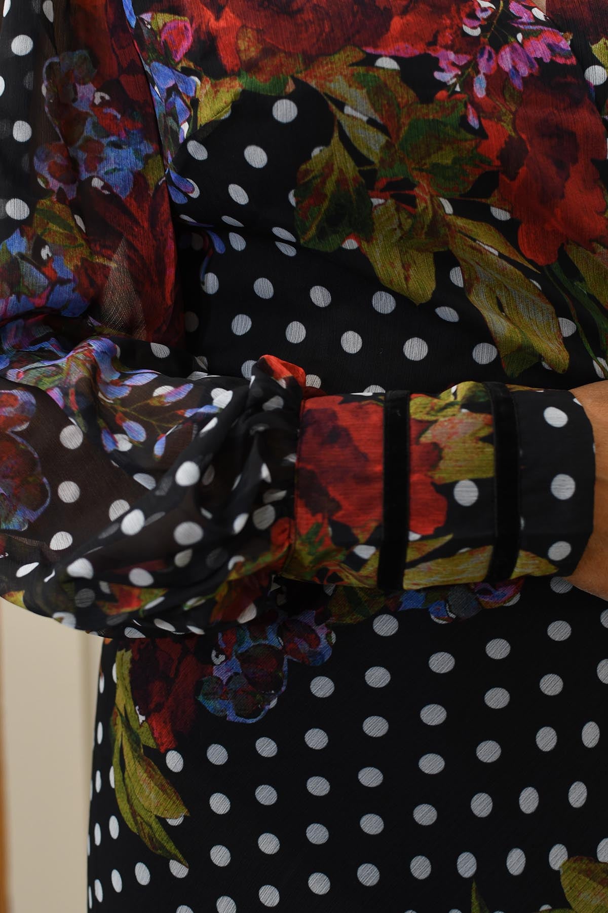 Hope & Ivy Black Tie Waist Velvet Trim Maxi Wrap Dress with Blouson Sleeve- Moni