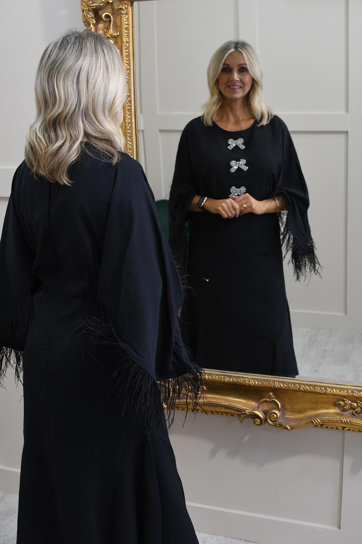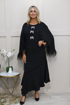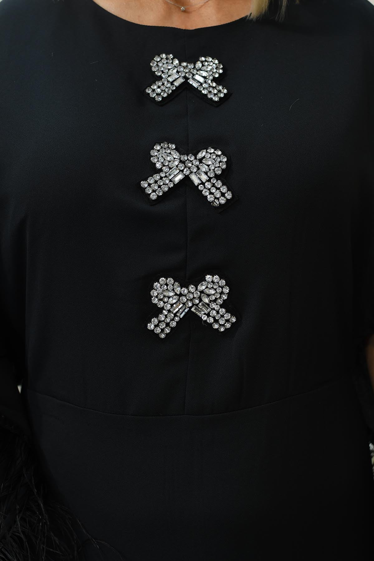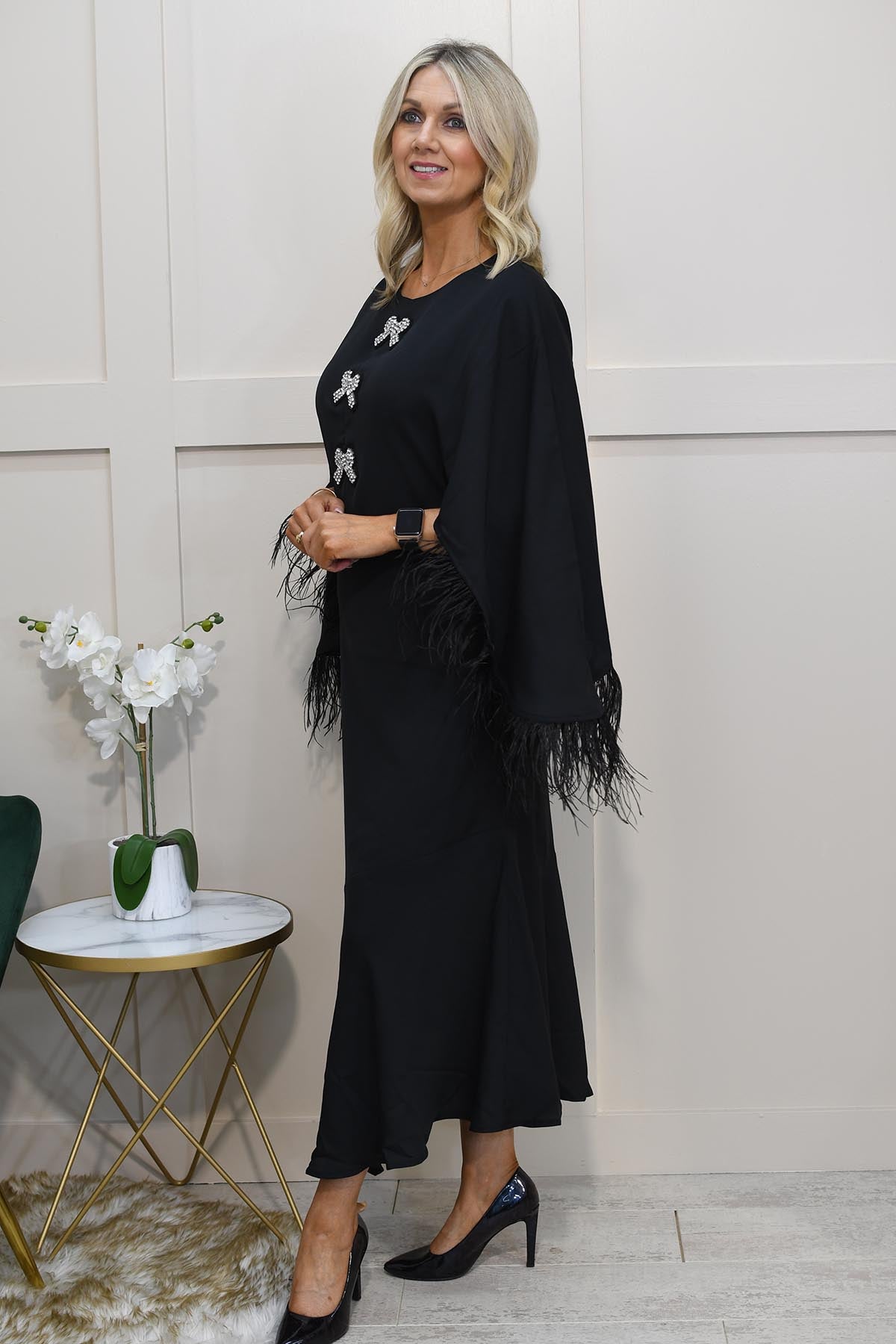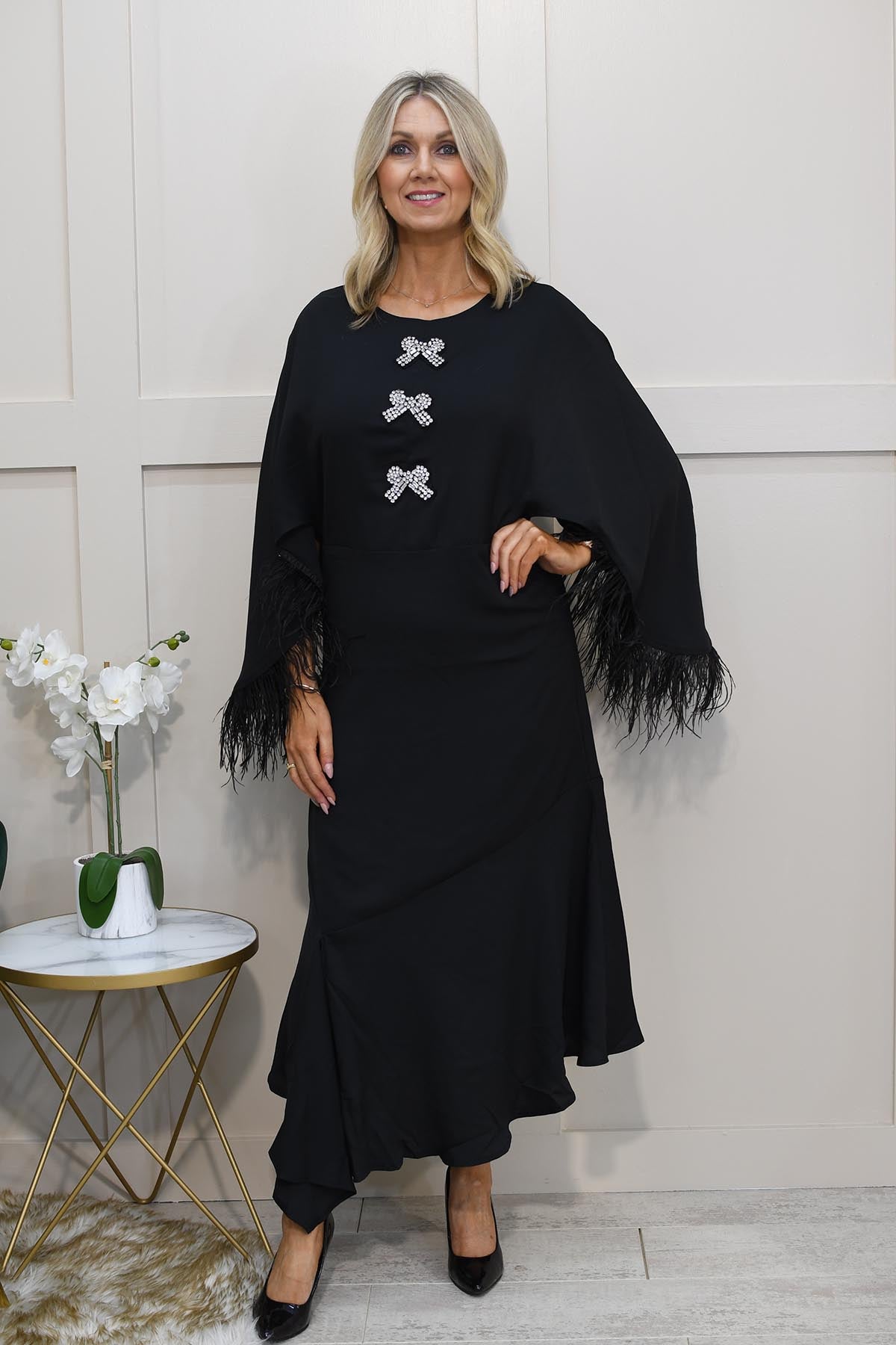 Hope & Ivy Puff Feather Trim Flutter Sleeve Midi Dress with Embellished Bows - Black- Helena