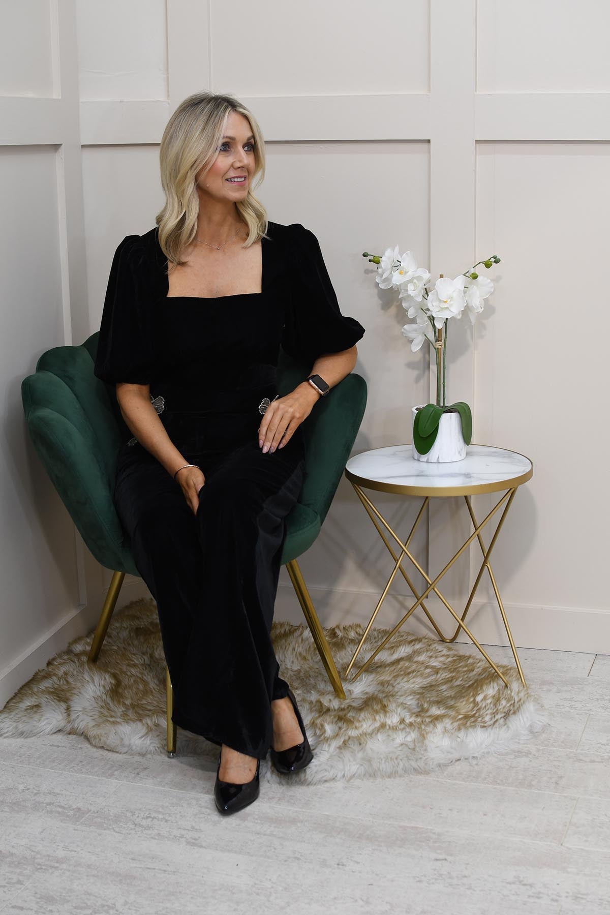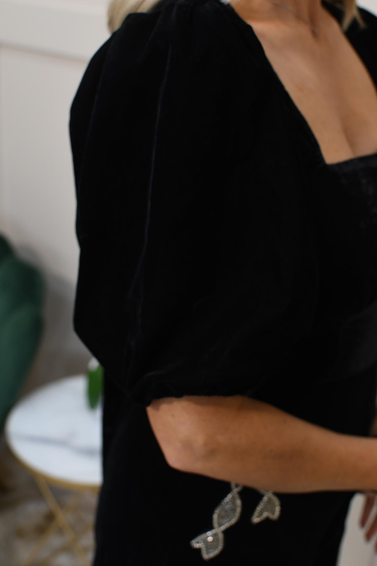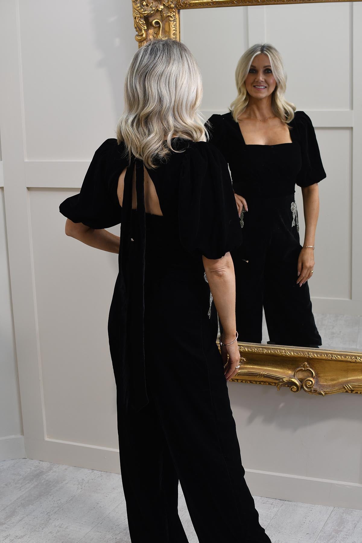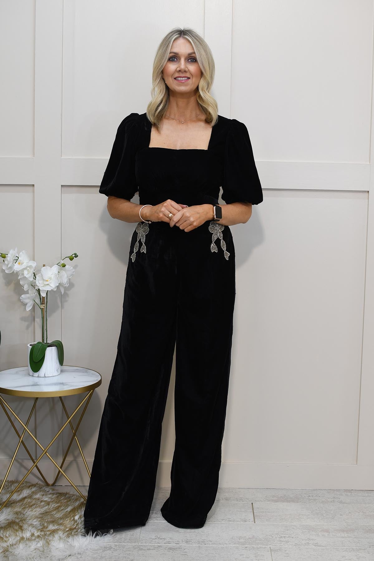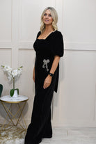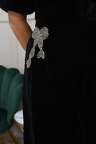 Hope & Ivy Puff Sleeve Velvet Jumpsuit with Embellished Bows - Black- Chelsea