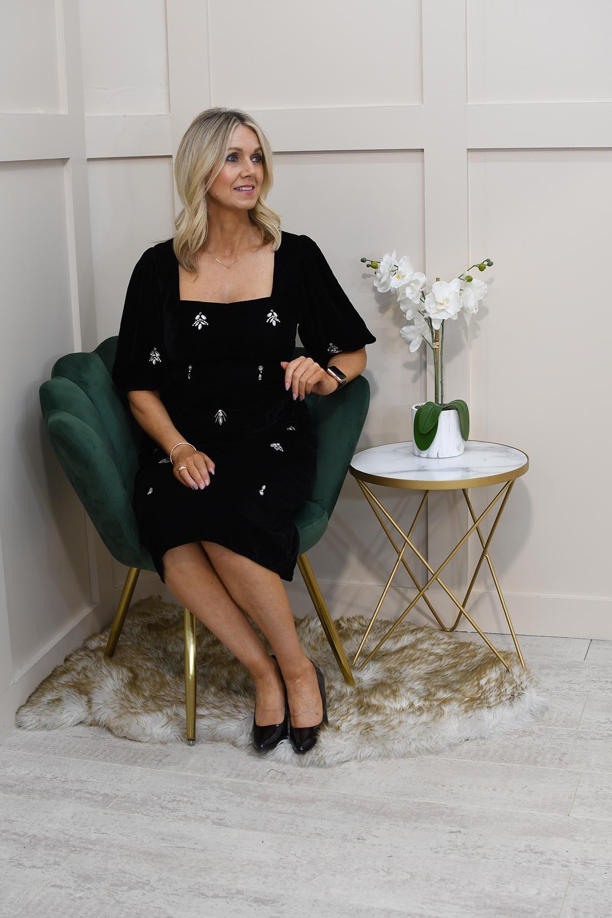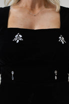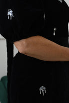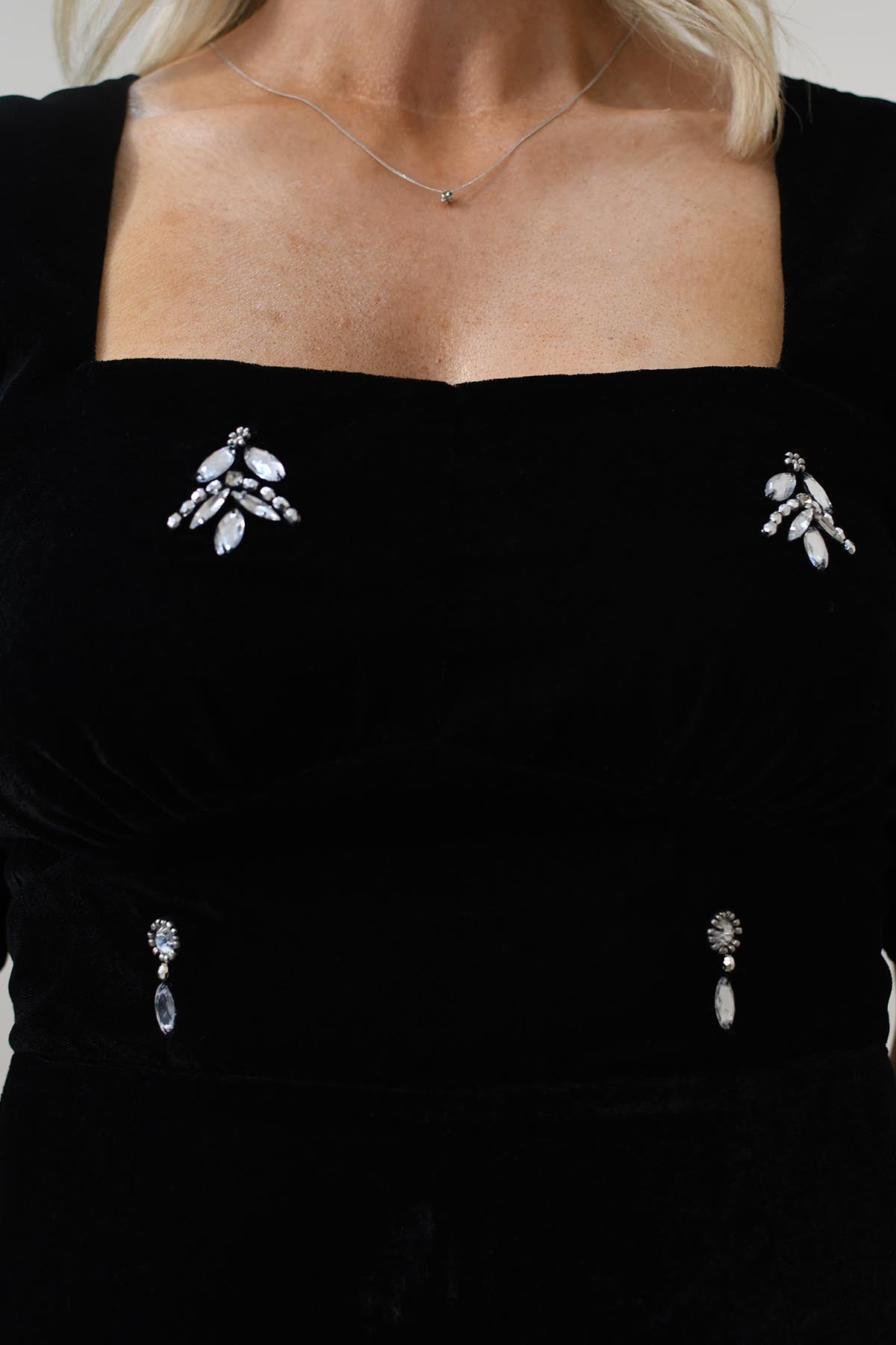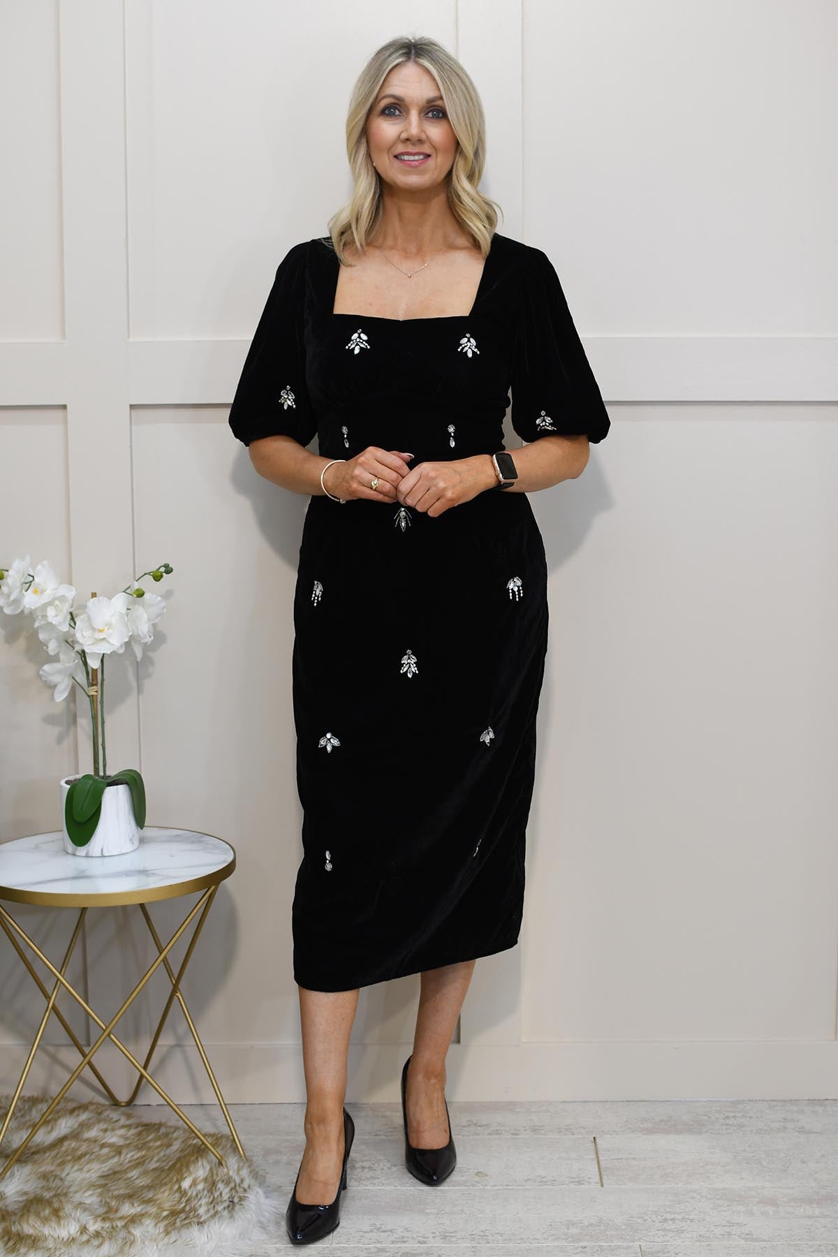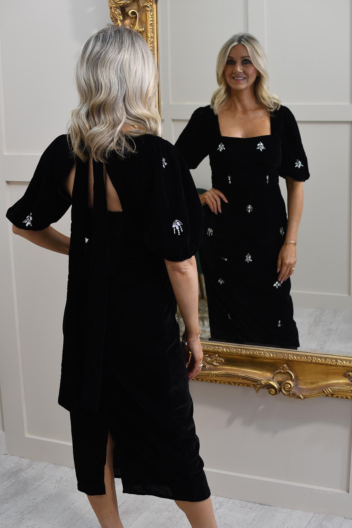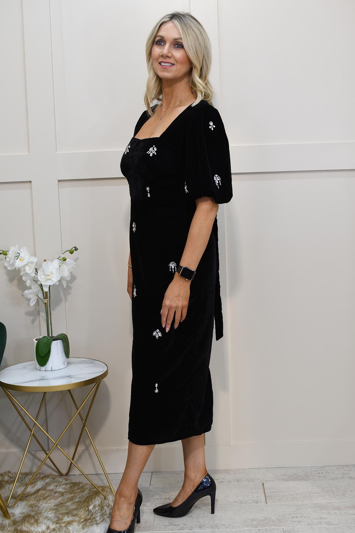 Hope & Ivy Puff Sleeve Velvet Midi Pencil Dress With Embellishment - Black- Bettina