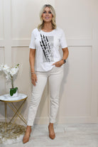 The I'CONA White Top With Silver Animal Print Graphic is a stylish and modern piece that adds a touch of glamour to your casual wardrobe. Crafted from high-quality fabric, this top is lightweight, breathable, and comfortable for all-day wear. The crisp white base is beautifully contrasted by the eye-catching silver animal print graphic, giving it a trendy and fashionable edge. The relaxed fit makes it versatile for pairing with jeans, trousers, or skirts, while the graphic detail adds a unique and contemporary twist. Elevate your everyday style with this chic and statement-making top.