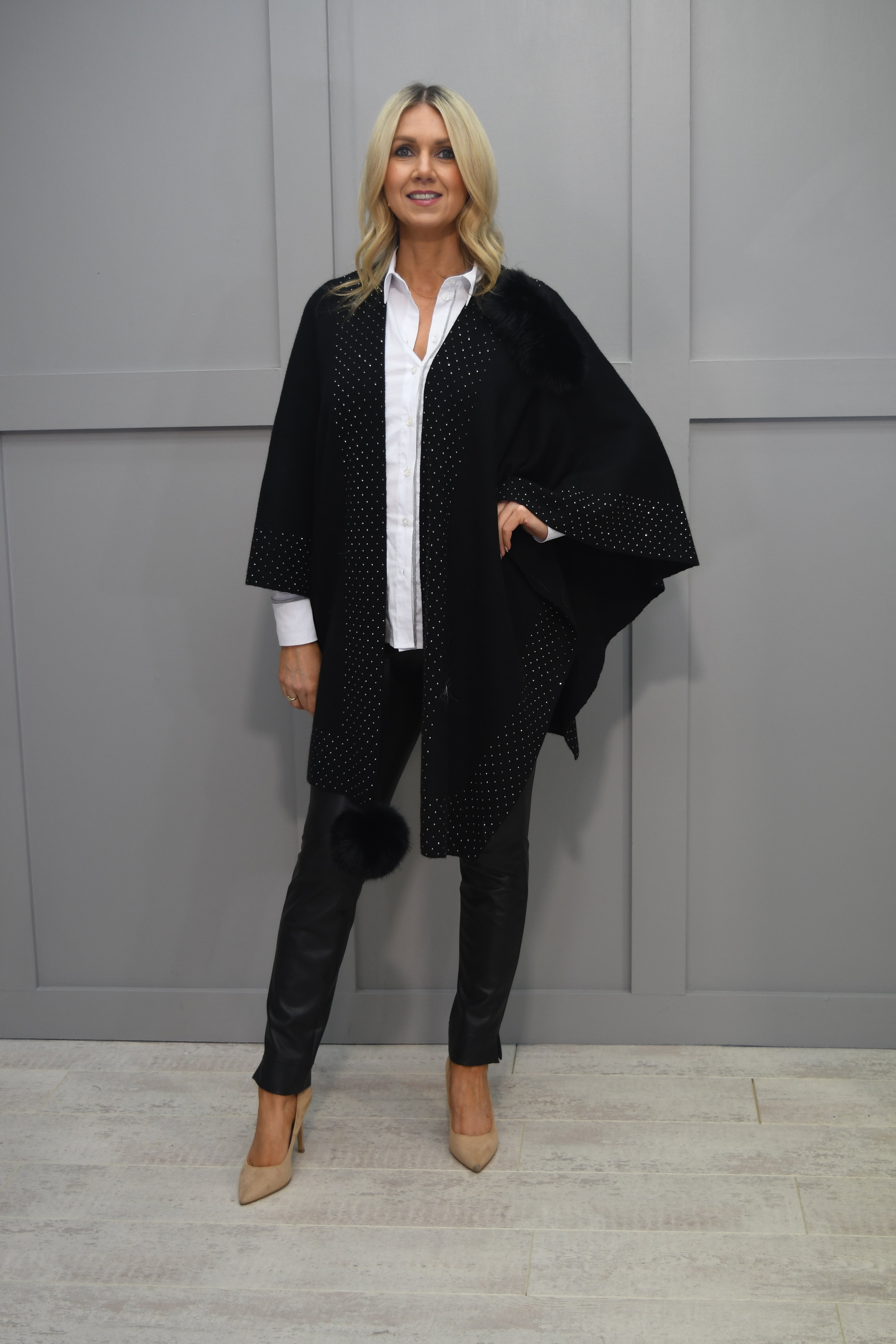 Joseph Ribkoff Black Knit Shawl with Diamante & Fur Detail Description